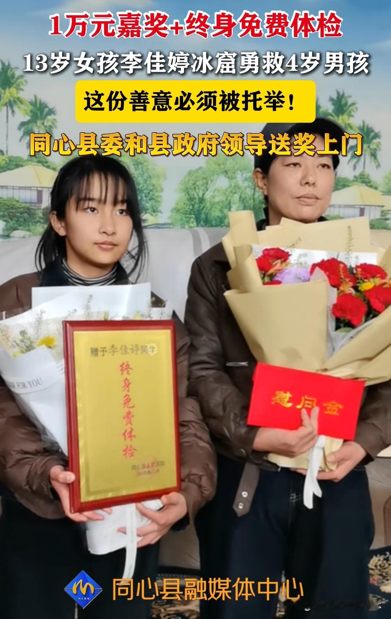13岁勇救落水男孩的李佳婷,这几天生活都不太平静了,不仅得到官媒点赞,当地领导也送奖上门,除了1万元奖金,还有终身免费体检。 这个13岁的女孩,是宁夏吴忠市同心县第二中学初一学生,前两天在同心县人工湖上,跳进冰窟窿救了一个4岁男孩,事后悄悄离开,回家还谎称自己是被洒水车弄湿的。 但是明珠不会久埋尘,她救人的事迹很快就被传开了,还上了官媒,同心县委和县政府领导也亲自带着奖状、1万元奖金和终身免费体检的福利上门慰问。 一场惊险,一个谎言,一次全网点赞。这个冬天,一个13岁女孩用她最本能的善良,暖了很多人的心。而社会回馈给她的,除了掌声和奖励,更有一份承诺:姑娘,你勇敢地守护了别人,现在,换我们来守护你一生的健康。 其实,最好的善良,是让每个善良的人都能平平安安。