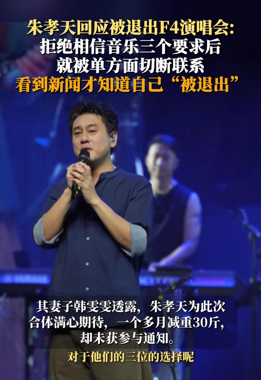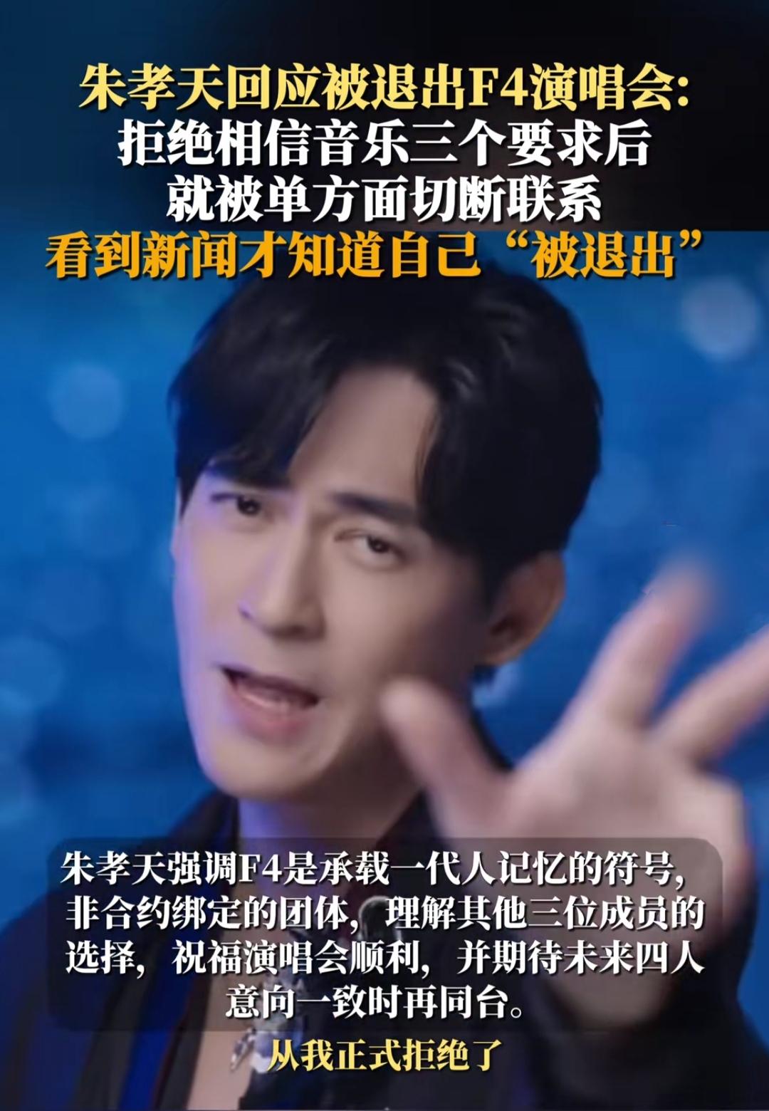 刚刷到F4演唱会消息,朱孝天居然“被退出”?看到他的回应,突然懂了成年人的体面有多不值钱! F4这个名字一出来,多少人的青春DNA动了?可最近网传的演唱会名单里,唯独少了朱孝天。等他亲自回应才知道,不是他不去,而是被单方面断联,看新闻才知自己被退出。 这事想想就透着委屈。相信音乐提了三个要求,他没同意,对方直接拉黑式断联,连句体面的告别都没有。明明是一起撑起一代人青春回忆的组合,最后却落得如此潦草。 其实娱乐圈这样的事不少,很多时候情谊在利益面前不堪一击。朱孝天宁愿站出来说清楚,也不敷衍粉丝,这份真诚反而让人动容。我们怀念F4,不只是怀念当年的歌和剧,更是怀念那种纯粹的少年意气。 可现实就是这么残酷,成年人的合作里,体面常常是最不值钱的东西。你怎么看这件事?是资本太冷血,还是圈子本就如此?