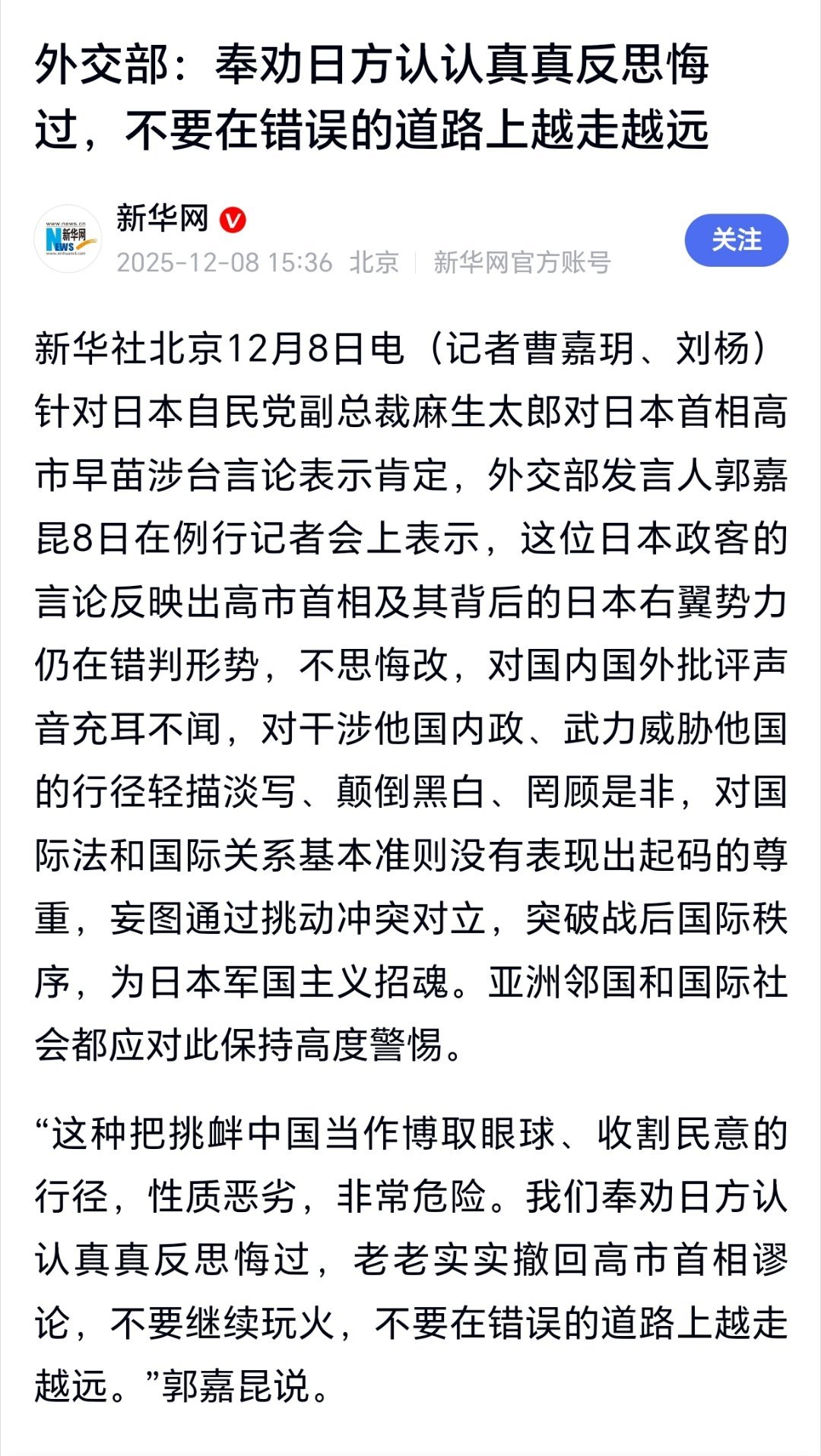 奉劝日方认认真真反思悔过外交部:奉劝日方认认真真反思悔过,不要在错误的道路上越走越远