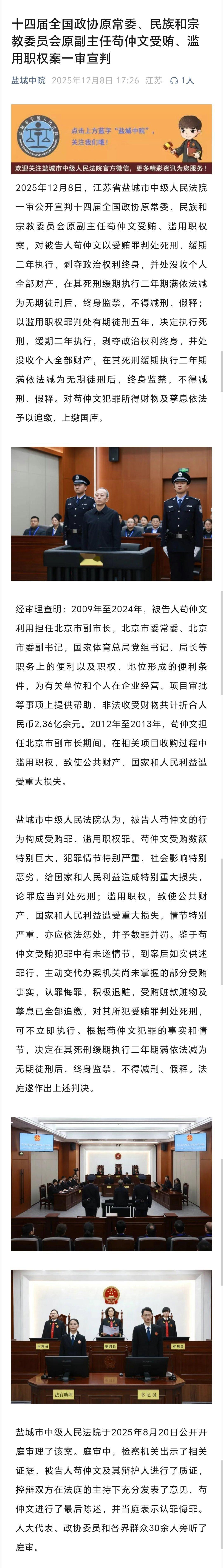 苟仲文一审被判死缓苟仲文利用职务便利为企业经营、项目审批等提供帮助,非法收受财物折合人民币2.36亿余元。