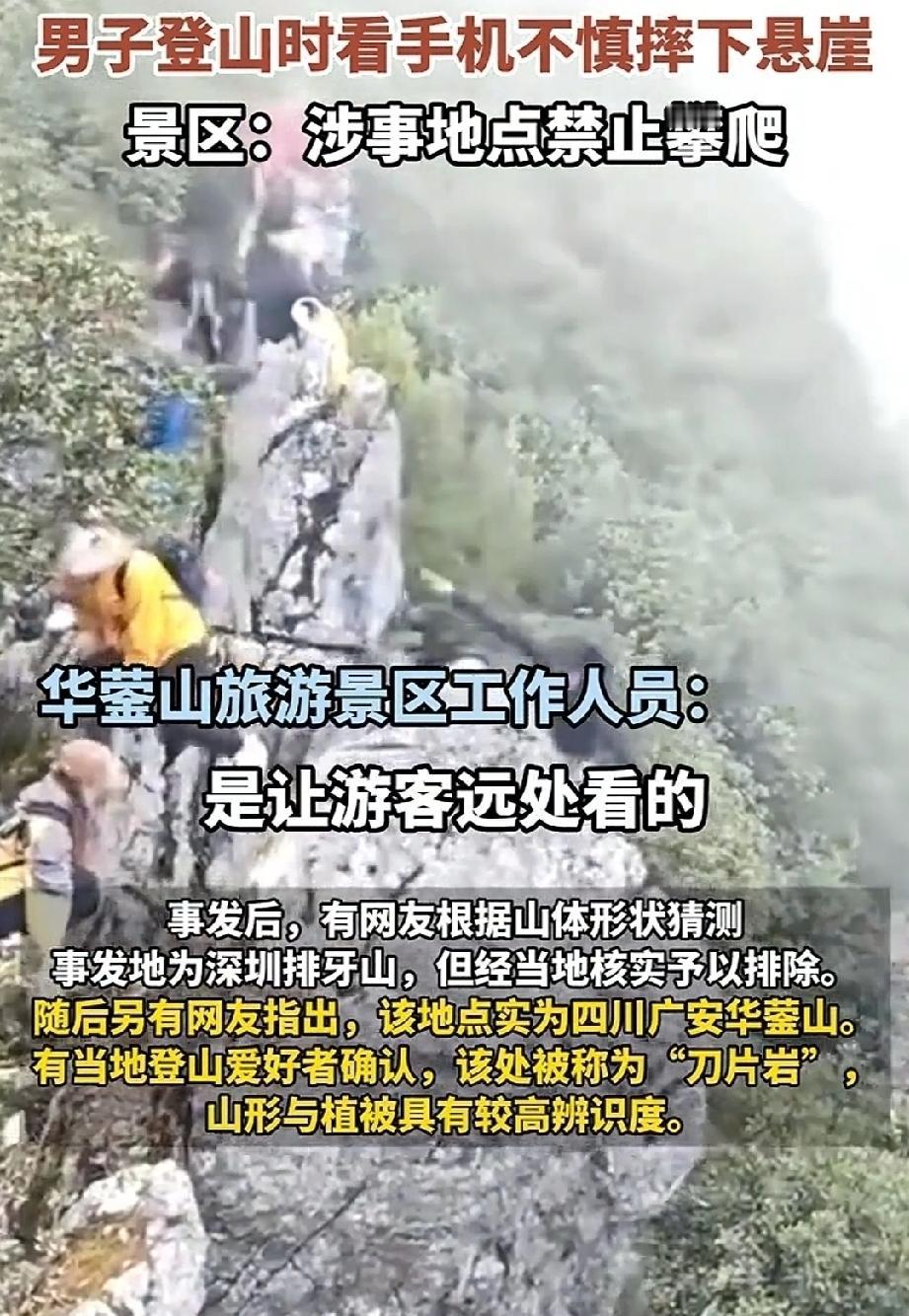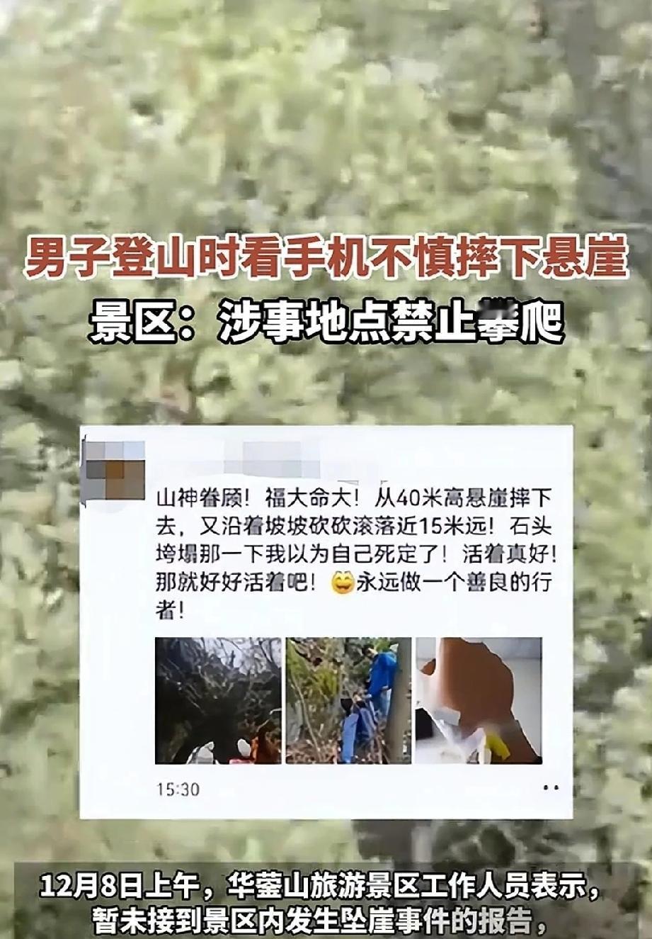 近日,四川广安。男子和几名户外运动爱好者一同去登华蓥山,登上了刀片岩。这里山势陡峭险峻,突兀的岩石像刀片一样难以立足。但也可以观赏到大自然的美丽风光 男子心情激动,赶紧拿出手机拍照,以留下这美丽的景色。他两脚分开,站在岩石上。不料一块岩石松动,不慎从40米的悬崖滚落。滚了大约15米远,被茂密的丛林挡住,只是受了点伤,没生命危险。事后,男子炫耀自己福大命大,有山神眷顾。 其实这哪里是什么山神眷顾,命大福大,得感谢丛林阻挡,和队员们的救援,才有幸捡了条命。如果真从40米高的悬崖坠落,哪还能生还。 户外运动是项好运动,但是第一要注意的是安全,千万不要冒险。 男子疑玩手机坠崖 事后发文福大命大户外运动