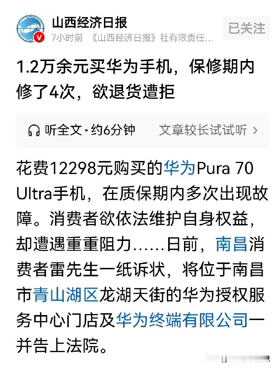 江西南昌,男子花12298元买了一部华为手机,使用一年后,手机出现卡顿、死机、暗屏多个问题。男子将手机送到服务中心维修,取回后,发现原有问题没解决,手机后盖又出现密封不严,维修人员说需返厂处理,之后,手机经过4次维修,始终没解决问题。男子对品牌失去信心,质保期内要求退换机,被拒后,将对方告上法庭,要求赔偿12298元购机款,以及精神损失费1元。而最终的结局,令所有人意想不到! 2024年4月19日,雷先生在某华为授权服务中心,买了一部华为Pura 70 Ultra手机,价格是12298元,保质期为2年。 因为相信品牌的质量和服务,雷先生才买下这款手机,本以为,用着安心,发生问题时服务省心。 可手机而在质保期内,就出现了各种各样的问题。 在技术维修方面,所有的手机故障,却一直没有彻底修复,且不断有新问题出现。 手机也故障至今未能修复,授权服务公司,却试图推脱责任。 2025年4月20日,雷先生的手机在使用一整年后,突然出现屏幕卡顿、死机、暗屏3种问题。 因影响了正常使用,雷先生当天就把手机,送到了当初买手机的店里去维修。 维修主管经过查看手机后称:是手机主板发生了故障,需要等材料更换。 雷先生手里的单子上写着:维修方式,为参数调整,以及手机保养,第二天取机。 第二天,雷先生取回了自己的手机,却发现故障照旧。 原来的卡顿、死机、暗屏3种问题一样也没有解决。 手机的后盖,反而出现了密封不严的情况,修了等于没修。 4天后,雷先生无奈之下,又把手机送回了店里。 维修人员称,后盖的密封处理,他们处理不了,需要返厂维修。 雷先生同意返厂,但他的要求是必须彻底修复,不能影响正常使用。 两天后,雷先生接到店里通知,说死机的问题已经修好了,手机将返厂处理后盖问题。 雷先生觉得,这次的返厂维修,肯定能将手机的所有问题解决。 然而,没想到,这只是雷先生一方所认为的。 事情一直拖到了5月3号,雷先生满怀希望的去店里取回自己的手机。 他去拿手机时,维修人员说已经修好了。 然而,让人意想不到的场面出现了。 雷先生当着店内所有人的面试机时,维修人员被现场打脸。 为了避免上次因回家后试机,出现问题后来回跑的情况。 雷先生现场试机,手机再次出现故障,不但仍存在屏幕暗屏问题。 还出现了微信数据无法传输的新故障。 当时,现场的维修主管,和所有的工作人员都尴尬的不行。 维修主管赶紧又把手机送到维修间去检修了,而且手机至今未能修复。 雷先生无论如何也没想到,花将近13000元买的手机,真的还不如三四千块钱的手机皮实耐用。 而且,手机同时出现多种问题不说,还给修不好。 反复折腾了几个月后,雷先生已经对这款手机,彻底失望了。 他认为,幸亏手机是在质保期内出现问题,如果过了质保期之后,凭维修店的服务和技术,手机基本就废了。 因手机在质保期内,这台手机,雷先生不打算要了。 随后,雷先生向华为授权中心提出退换手机。 万万没想到,竟遭到了当场拒绝。 店长给出的理由是,手机的同一故障,在一年内维修两次才能换机。 而雷先生虽然在半年内修过4次手机,但都属于检测服务,实际并没有维修。 雷先生当时就气炸了:我从一开始就要求维修,你们维修人员自己说的需要换主板,但实际上直到最后,也没给更换。 所以才造成,手机虽经多次维修,仍存在问题。 一部高档手机出现多个问题修不好,不给换机,还一直推脱责任,难道消费者只能吃亏? 无奈之下,雷先生对方告上法庭,要求授权服务中心赔偿,12298元手机费,以及1元精神损失费。 然而,就在法院立案,将要开庭时,华为方主动联系雷先生,提出和解。 和解方案:更换一款即将上市的新款手机。 而雷先生对品牌失去了信任,对新款手机也不感兴趣,而是要求退还购买手机的原价款。 根据《消费者权益保护法》第24条:经营者提供的商品或者服务不符合质量要求的,消费者可以依照规定、当事人约定退货,或者要求经营者履行更换、修理等义务…… 雷先生购买的手机,在质保期内出现多种问题,经多次维修仍未解决,表明商家提供的商品不符合质量要求,其有权要求退货或更换。 虽然店长以未达标准拒绝换机,但手机存在多种问题且维修多次未好,已影响正常使用。 符合法定解除合同条件,雷先生要求退换机是有法律依据的。 《消费者权益保护法》第10条:消费者享有公平交易的权利。 授权服务中心,在手机多次维修未解决问题的情况下,拒绝为雷先生退换机,这种行为,侵犯了雷先生的公平交易权。 且手机不仅存在质量问题,维修服务也未达到要求。 授权服务中心拒绝退换机,违背了公平交易原则,雷先生有权维护自己的合法权益。 最终,对方给雷先生全额退款12298元,又给了8000元的慰问金。 随后,雷先生撤诉。