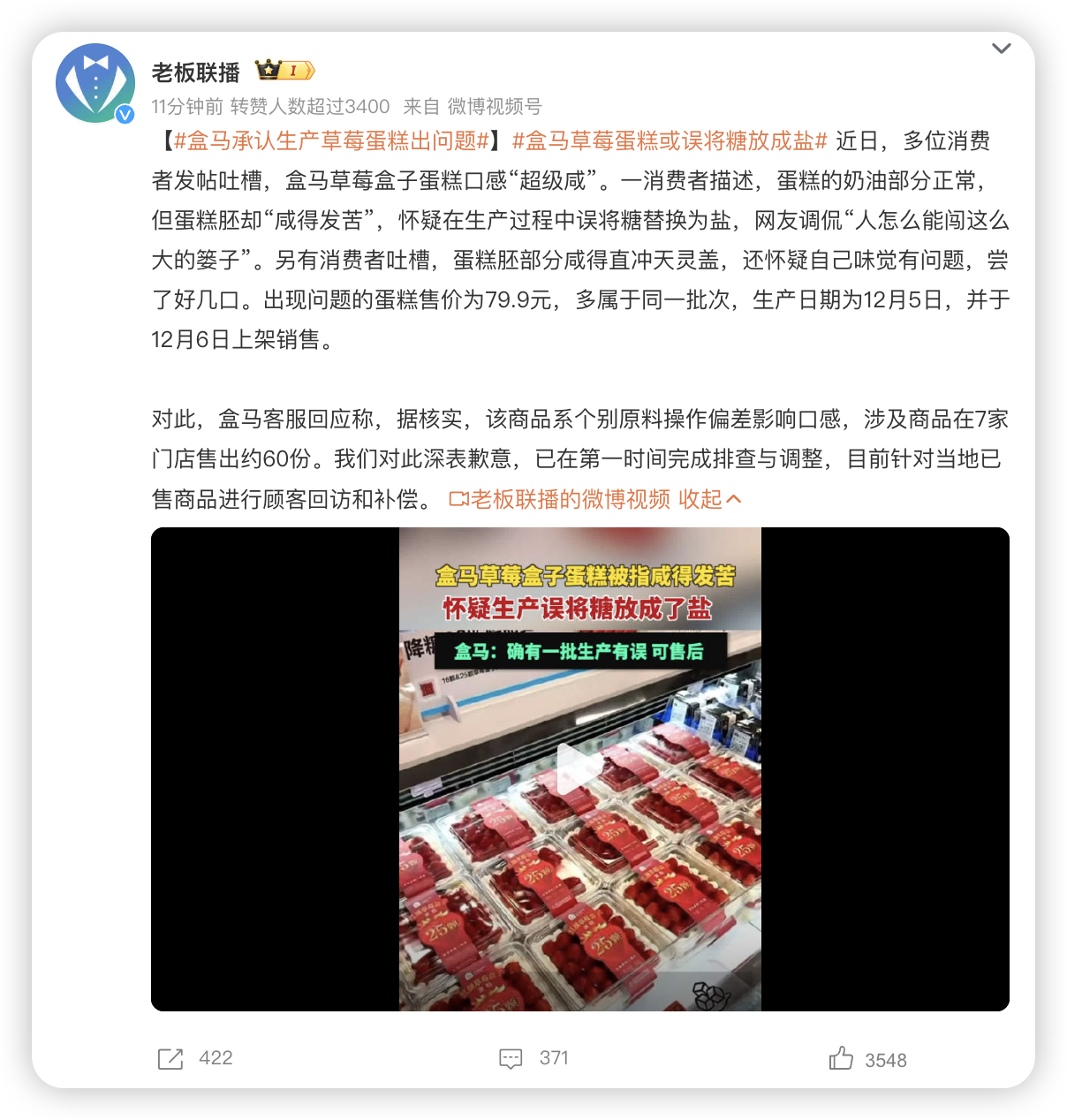 吃个蛋糕可真难啊,怀疑在生产过程中误将糖替换为盐,蛋糕胚“咸得发苦” 盒马承认生产草莓蛋糕出问题