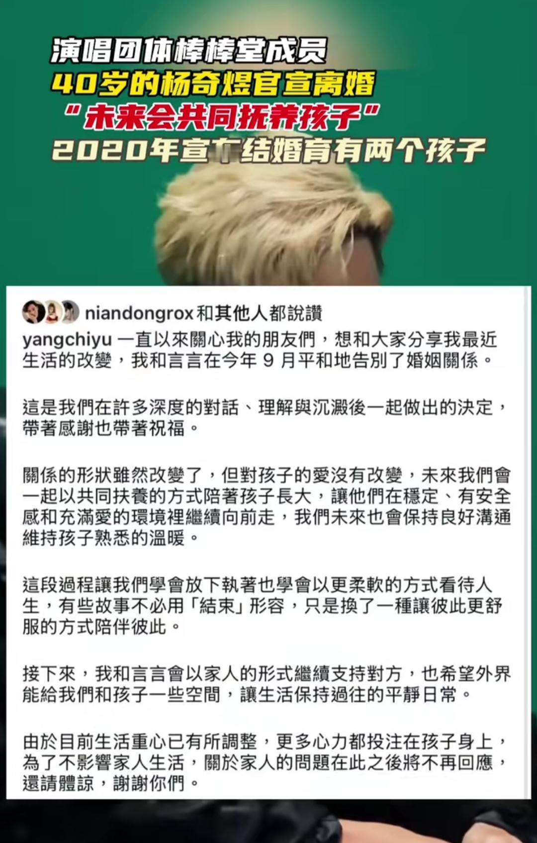 当年追过的棒棒堂成员小煜居然官宣离婚了!消息一出,没有狗血撕逼,没有互相指责,只有一句“换种方式陪伴”,反倒让人有点鼻酸。 他说今年9月就和平分开了,5年婚姻育有两个孩子,往后会共同抚养,还会以家人的形式支持彼此。没有拉扯不清的恩怨,把对孩子的责任和过往的情分都放在了前头。 想想现在的娱乐圈,多少情侣、夫妻分开后反目成仇,撕破脸皮互爆黑料。小煜这种体面告别,反而让人看到了成年人感情里最珍贵的分寸感——不爱了但不伤害,分开了仍守底线。 我们怀念的不只是当年唱跳的少年,更是这种不纠缠、懂尊重的成熟。感情的结局从来不是只有恨,好好说再见,也是一种圆满。你认可这种离婚方式吗?