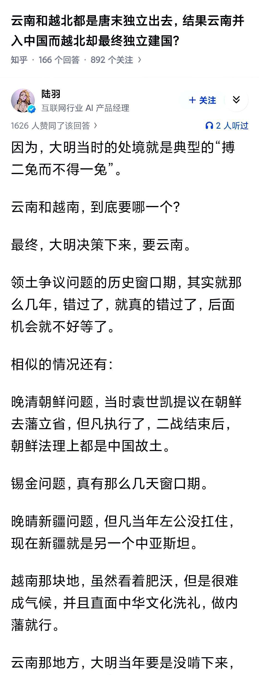 世界历史上很多时候就是个偶然因素造成一个局面,然后延续下来,成了如今的政治态势,比如卡斯蒂利亚女王伊莎贝拉面临阿拉贡和葡萄牙的求婚,答应了阿拉贡,后来就是阿拉贡和卡斯蒂利亚联合成了西班牙,葡萄牙成为另一个国家。叙利亚独立时法国人说你这都是穆斯林,得给基督徒一个地方,于是切出一块成了黎巴嫩。 中国边疆的版图博弈里,却藏着比偶然更深的战略密码。 唐朝咸通年间的某个秋日,安南都护府的汉人商贾正清点货栈,突然听见城外马蹄声碎——南诏士兵的弯刀已经劈开了城门,火焰顺着交趾街的商铺蔓延。 这场突袭不仅让安南元气大伤,更撕开了中原王朝西南防线的第一道口子。 南诏就像盘踞在云贵高原的猛虎,左爪能拍向巴蜀粮仓,右爪可挠到岭南商道,尾巴一甩还能扫到安南海岸。 后来它攻破成都外城时,蜀地百姓躲在残垣后看见,吐蕃与南诏的联军正把锦缎、盐铁甚至工匠捆在马背上,烟尘里飘着破碎的蜀锦纹样。 相比之下,越南政权最风光的时刻,不过是领兵打到南宁城下,那些战绩在《宋史》里只换来了“蛮夷小乱”四个字的潦草记载。 为何同是南方边疆,云南与越南的分量天差地别? 有网友划过地图便懂:越南像被南岭锁住的孤岛,中央政权鞭长莫及时常无奈放手;云南却是西南的“总开关”,握住它就能同时钳制巴蜀、岭南与安南,从来都是必争之地。 这种战略级差在东北同样明显。 朝鲜半岛上的高句丽再强,毕生折腾也只是在辽东边境抢些粮草;东北平原崛起的政权却截然不同——从辽金到后金,这片黑土地上的力量两次把中原士族逼得衣冠南渡,让神州陆沉成了历史课本里的血色注脚。 是地理写下了答案:朝鲜半岛多山,农耕面积有限,难成气候;东北平原则沃野千里,既能种粮养兵,又能与草原部落互通有无,简直是天然的割据温床。 有人或许会问,越南难道没有过逆袭机会? 史实给出的回应很冰冷:它最接近突破的那次,军队刚到南宁就因粮草断绝溃散,地理的隔绝终究成了迈不过的坎。 从南诏扰唐到后金入关,这些故事藏着同一个逻辑:边疆土地的价值,从来不只看归属历史,更要看它是否能撬动全局。 今天再看云南,从古代的西南屏障到如今的面向南亚东南亚辐射中心,那些被偶然事件改写的版图线条背后,其实早被山川地势刻好了必然轨迹。 地图上的每一块颜色,都藏着历史反复计算过的战略权重。
