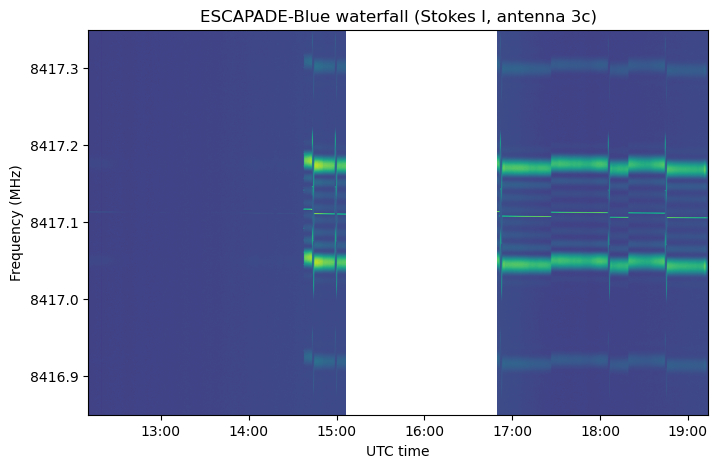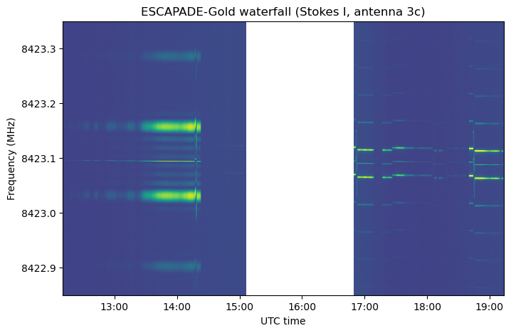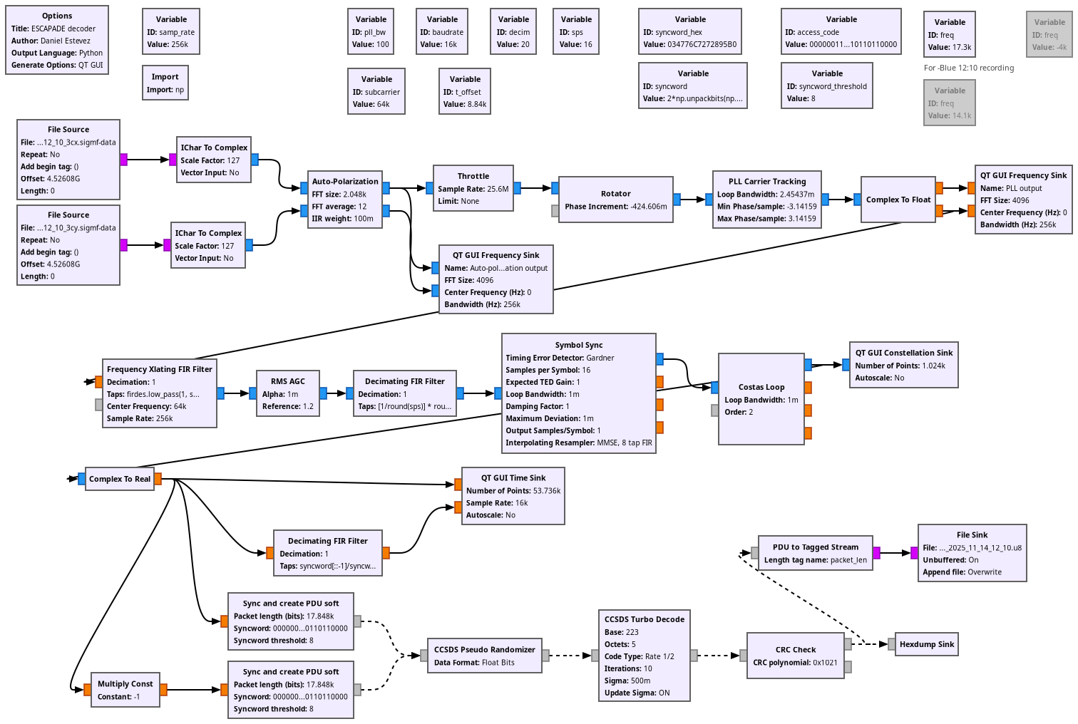 【ESCAPADE火星双星任务X波段遥测信号解码分析】ESCAPADE是美国加州大学伯克利分校空间科学实验室(UC Berkeley Space Sciences Laboratory)主导、火箭实验室(Rocket Lab)建造的双星火星磁层探测任务。该任务于11月13日搭乘蓝色起源(Blue Origin)新格伦(New Glenn)运载火箭的第二次飞行任务NG-2发射。两颗探测器将首先在日地拉格朗日L2点驻留约一年,待火星发射窗口开启时返回地球实施引力弹弓,随后进入霍曼转移轨道飞向火星。此类飞行轨迹在航天史上尚属首次。发射次日,地面站在距地球约20万公里的距离上成功捕获两颗探测器的X波段遥测信号。本文基于艾伦望远镜阵列(Allen Telescope Array, ATA)的实测数据,系统阐述信号接收、解码及遥测分析结果。观测时间为11月14日,系探测器发射后首次在美国西海岸上空可见。观测者利用喷气推进实验室HORIZONS系统提供的星历数据计算方位角与仰角指向序列。采样频率设为10.24 Msps,中心频率8420 MHz,可覆盖双星下行链路。德国AMSAT-DL组织此前已观测到信号并分享瀑布图,因此无需额外搜索频率。事后核查HORIZONS数据可知,两颗探测器采用不同下行频率:- ESCAPADE-Blue:8417.165797 MHz(X波段60厘米固定天线)- ESCAPADE-Gold:8423.148147 MHz(同为X波段60厘米固定天线)值得注意的是,Gold星使用标准深空网(DSN)第20信道频率,而Blue星频率为非标准分配。初始计划使用阵列1a天线,但该天线采用旧馈源设计,高频灵敏度不足。未见信号后,切换至配备新型"安东尼奥"(Antonio)馈源的1b与3c天线,高频灵敏度显著提升,成功捕获稳定信号并持续跟踪至目标没入地平。3c天线记录的Stokes I瀑布图显示双星信号均存在,但强度剧烈波动,推测探测器可能使用低增益或中增益天线并持续调整姿态。图中段白色中断为存储磁盘满溢所致,数据迁移后恢复记录。平均频谱显示,在双星载波两侧约1 MHz处存在测距单音信号。1b天线的信噪比显著劣于3c天线,原因尚不明确。鉴于3c天线数据质量更优且信号强度足以支持单天线解码,后续分析仅采用3c天线数据。Blue星瀑布图细节显示,在14:37:24 UTC前信号极弱,之后功率突增,表明天线切换。IQ文件分析表明,此时发射机开启(遥测调制建立耗时数秒),并出现地面站频率扫描与跳频现象。Gold星在14:22:47 UTC信号完全消失,后出现极弱低速率信号,疑似启用另一副天线。中断前后均存在地面站扫频、跳频及信号功率的渐变与突变,表明多次天线切换。中断后调制方式转为更低符号速率。遥测采用PCM/PSK/PM体制:遥测数据经BPSK调制到副载波,再相位调制至射频载波,保留残余载波。本记录识别出两套配置:- 高速模式:符号速率16 kbaud,副载波频率64 kHz- 低速模式:符号速率2.5 kbaud,副载波频率25 kHz两种配置的副载波与符号速率之比均为整数,符合空间数据系统咨询委员会(CCSDS)关于残余载波频率处遥测功率为零的推荐标准。编码方式为CCSDS Turbo码(码率1/2),帧长1115字节。遥测帧结构符合CCSDS TM空间数据链路层协议。存在一项特殊机制:无数据发送时,发射机重复发送最后一帧而非空闲帧。该机制导致主信道与虚拟信道帧计数重复,初期造成协议识别混淆。最终确认全帧内容完全一致,确为CCSDS标准帧。Blue星航天器标识符(SCID)为0x7b,Gold星为0x56,均未在SANA(Spacecraft ID Assignment Authority)注册表中查询到对应分配,尽管双星已在该机构注册。帧结构含帧差错控制域(Frame Error Control Field),但无操作控制域(Operational Control Field)。仅虚拟信道2被启用,副帧头标志位有效。副帧头为8字节时间戳,采用64位大端序整数,单位2⁻¹⁶秒,起算历元为1970年1月1日00:00:00 UTC(未验证是否计入闰秒)。该格式不符合CCSDS蓝皮书规定的次帧头标识域与长度域结构。通过统计重复帧数量间接计算下行链路利用率,Blue星在约19:00 UTC开始大量传输数据。基于主信道帧计数统计的丢帧数显示,除信号衰落段与上行扫频期间外,解码基本无误。虚拟信道2承载CCSDS空间包,仅使用APID 51。数据包无次级帧头,序列计数字段恒为零。包长多样,但若干特定长度频繁出现。载荷中包含大量ASCII字符串,疑似Linux系统日志,例如:```/mnt/mmc0/logs/compton/inv_sts/inv_sts-1763132730.mtc.gzE_CMD_HIST: [ OK ] EPS_SPOC_DIO_ST_OCP_EN ENABLE_STATE=[0, Off]E_INFO: SetThermostatMode: Setting thermostat 'EESA' to mode ClosedLoop```消息中的"FJ"指FlightJAS,即MAX飞行软件所使用的序列化语言。MAX软件最初由Aerospace Sciences Institute(ASI)开发,现为Rocket Lab所有。鉴于ESCAPADE基于Rocket Lab光子(Photon)平台,采用MAX系统符合预期。深空任务遥测中出现此类详细明文日志,与传统高度压缩的纯数值遥测形成鲜明对比,反映出现代航天器采用基于Linux的软件体系,而非传统定制软件架构。推测这些ASCII字符串嵌于包含数值数据的序列化结构体中,完整协议逆向有待后续研究。本次观测的IQ数据已以"Recording of ESCAPADE X-band telemetry with the Allen Telescope Array shortly after launch"为题发布于Zenodo平台。用于天线跟踪计算、瀑布图生成的Jupyter笔记本及GNU Radio预处理流程图、解码流程图、帧分析笔记本与全部解码帧二进制文件已同步开源。
