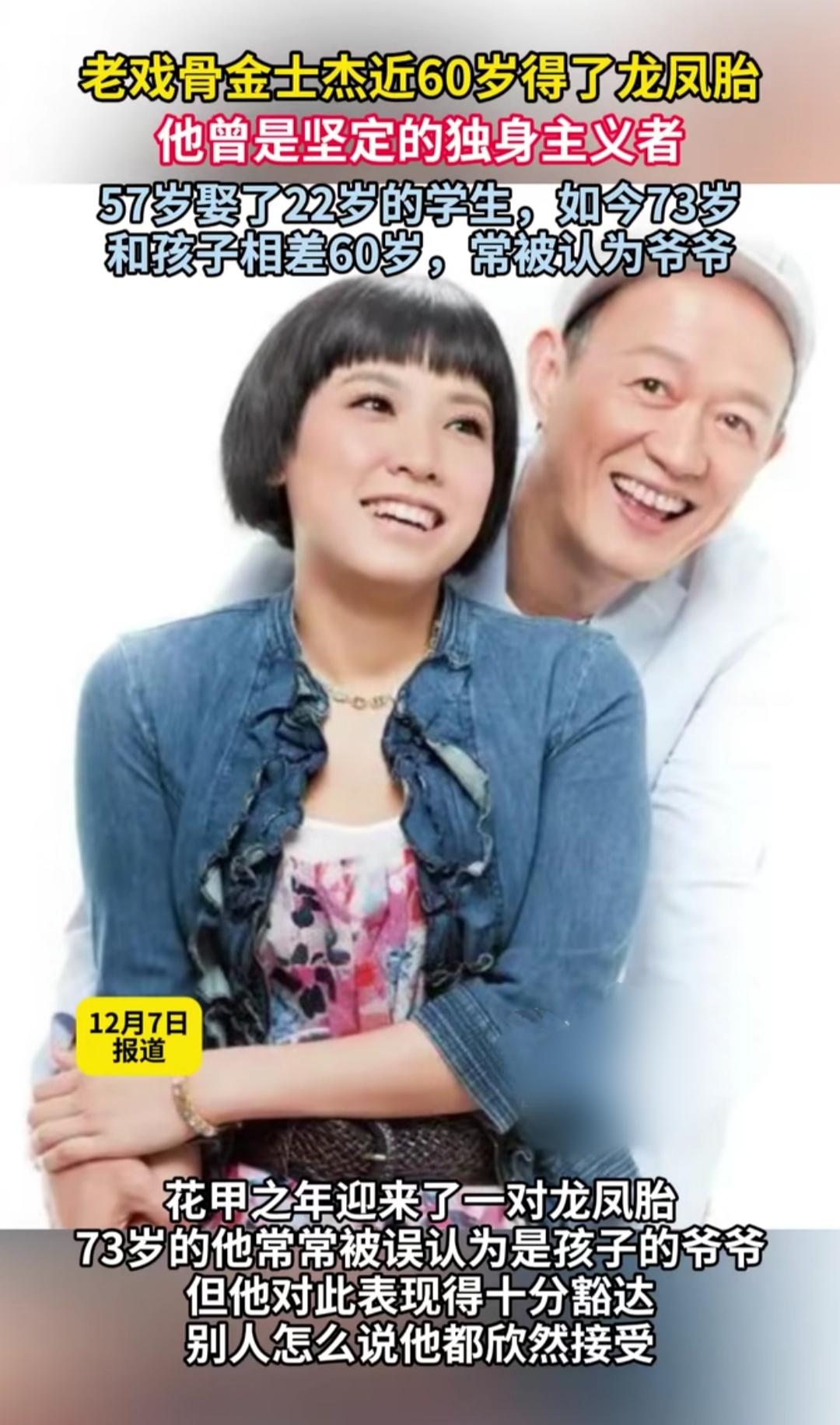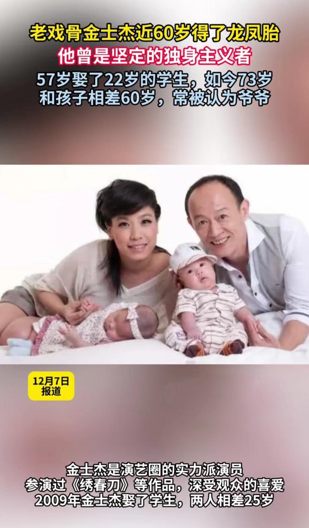 谁能想到,当年说“坚定不结婚”的金士杰,57岁娶了22岁的学生,近60岁还得了龙凤胎——如今73岁的他,和孩子差了60岁,出门常被认成爷爷。 他在采访里说,老来得子其实心里挺脆弱的,总怕自己陪不够孩子长大,所以更珍惜每一次相处的时光。从前是不婚主义者,后来却把日子过成了“守着孩子的老父亲”,这种反差里全是柔软。 其实人生哪有什么定数?年轻时的坚持会被后来的温柔推翻,那些“绝不”的事,遇上对的人、对的牵挂,都会悄悄松口。他被误会成爷爷也坦然,无非是把日子过成了自己想要的模样。 你觉得这种“推翻从前”的人生,算不算另一种圆满?