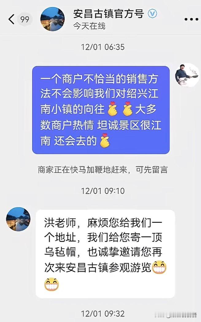 洪剑涛去安昌古镇试乌毡帽后续来了! 洪剑涛在第二家店试戴并买了一顶乌毡帽,也就是说,不是所有店都不让试。 当地的文旅也联系了他,他没想到会引起这么大的反响。 当时他发了这个视频后,有很多人认为他是有意遮挡五元提示牌,他说确实没有,都没有提示牌。 还有人说他试吃人家萝卜干不买,他也发视频证实了他试吃了也买了。 他也在视频中跟阿婆道歉了,首先是他不了解乌毡帽的特性。 再就是他对于试戴要钱这个事存在疑义,所以就在视频中发出来了,视频中发出来的只是一部分,一个多小时的视频不能都发出来,希望大家能理解。