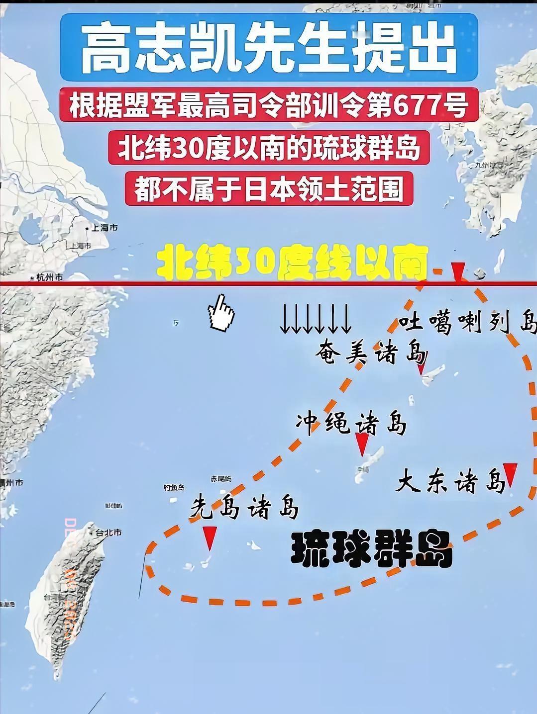 高志凯先生真是厉害,提出的主张总是简单明了。 琉球不是日本的,他一句话就说清楚:北纬30度以南就没有日本的领土。 给高先生点赞![赞] 这句话可不是随口一说,背后藏着实打实的法理依据。《开罗宣言》《波茨坦公告》早明确了,日本主权只限于本州、北海道等四岛,琉球压根不在其中。 美国当年私相授受把施政权给日本,可施政权≠主权,就像借了别人的房子暂住,怎么也成不了房主。历史上琉球本是独立王国,和中国有几百年宗藩关系,被日本吞并本就是侵略行径。 现在日本占着琉球装主人,本质是无视二战秩序。高先生的话戳破了谎言:领土归属看法理和历史,不是谁占着就归谁。 你觉得琉球未来该走向自治还是独立?评论区聊聊!