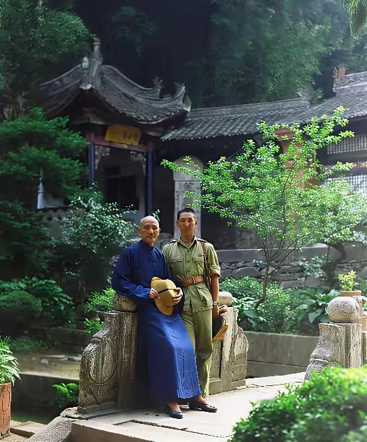 这是蒋介石和儿子蒋纬国在一起的照片。 请大家看看蒋介石的穿着打扮, 一顶礼帽, 上穿一件黑色的马褂上衣, 下穿一件蓝色的长袍, 你再看看蒋介石的穿着,还有什么特别之处?