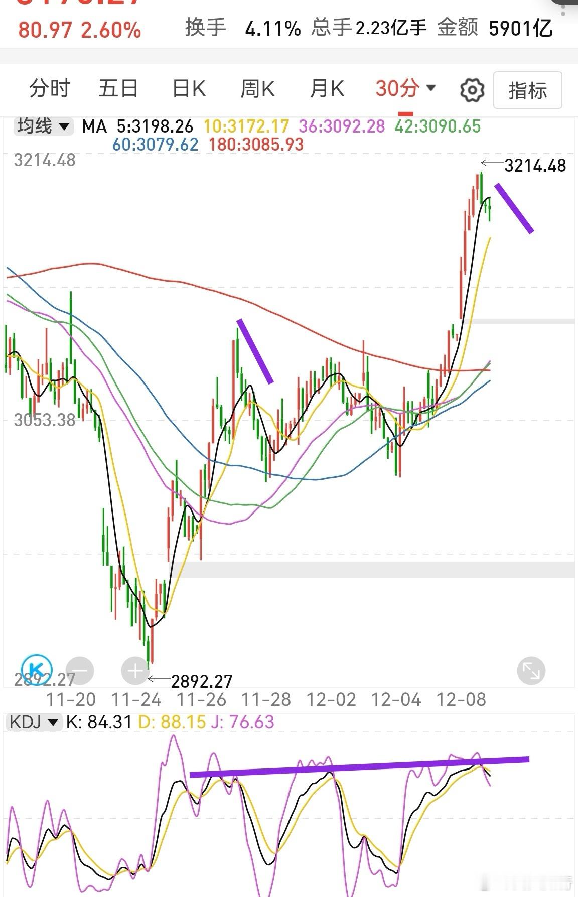 创业板3200之上很难站稳,月线缺乏站稳3200的动力。今天突破3200,有点类似27号,但相对温和些。目前半小时kdj死叉,明天小幅回落是有的。