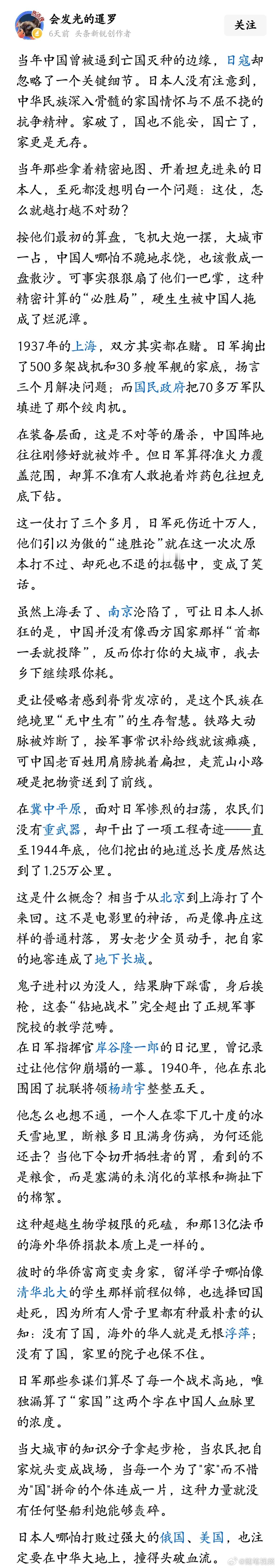 ZampampY 3 2025-12-08 22:05 它们按照清朝的标准来评估当时中国的抵抗力量 追逐 回复 12-08 22:52 感谢孙中山先生带领的辛亥革命推翻了满清,让中华民族恢复一些元气对抗日本入侵,否则真的让鬼子趁中华民族最虚弱的时候取代满清占据中国。