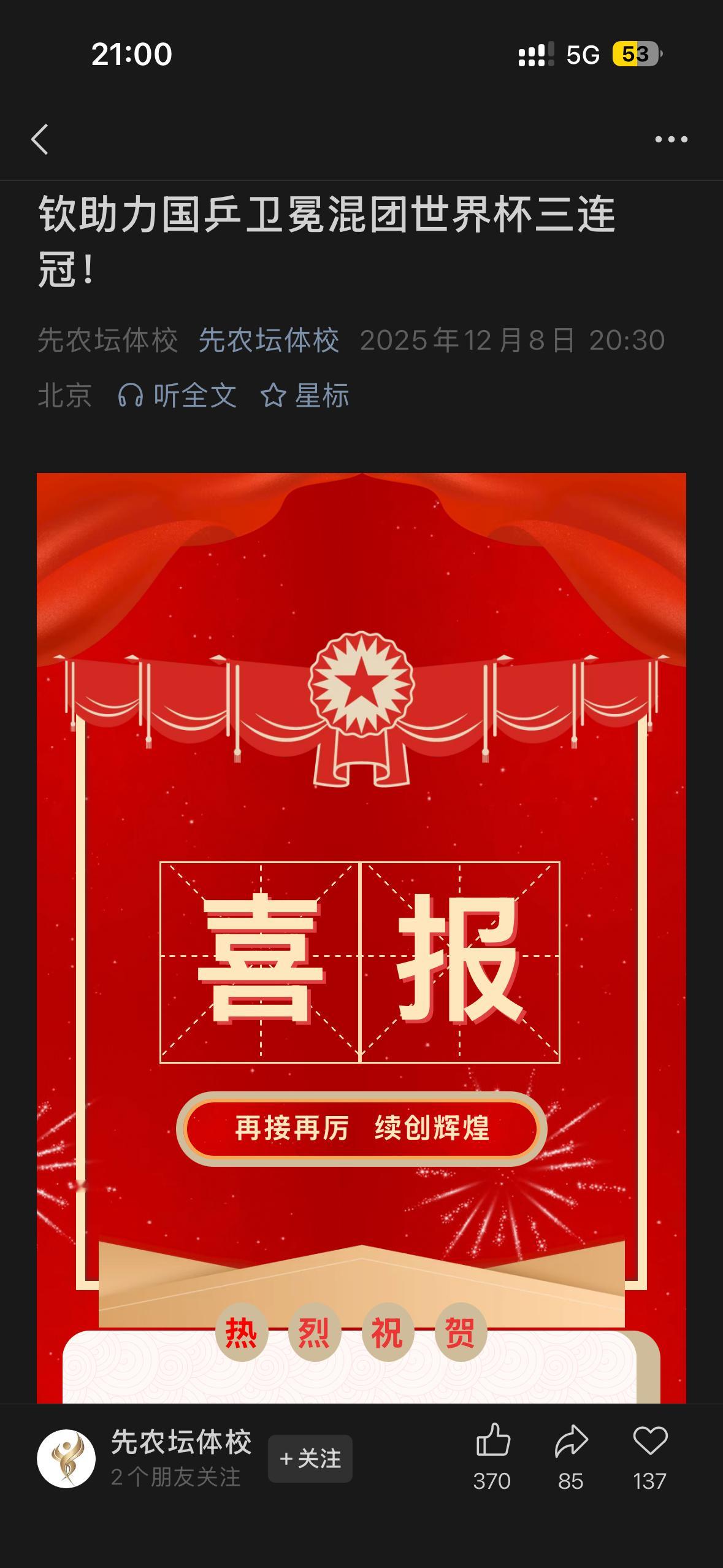 王楚钦20251208|先农坛公众号喜报恭喜王楚钦助力国乒混团世界杯三连