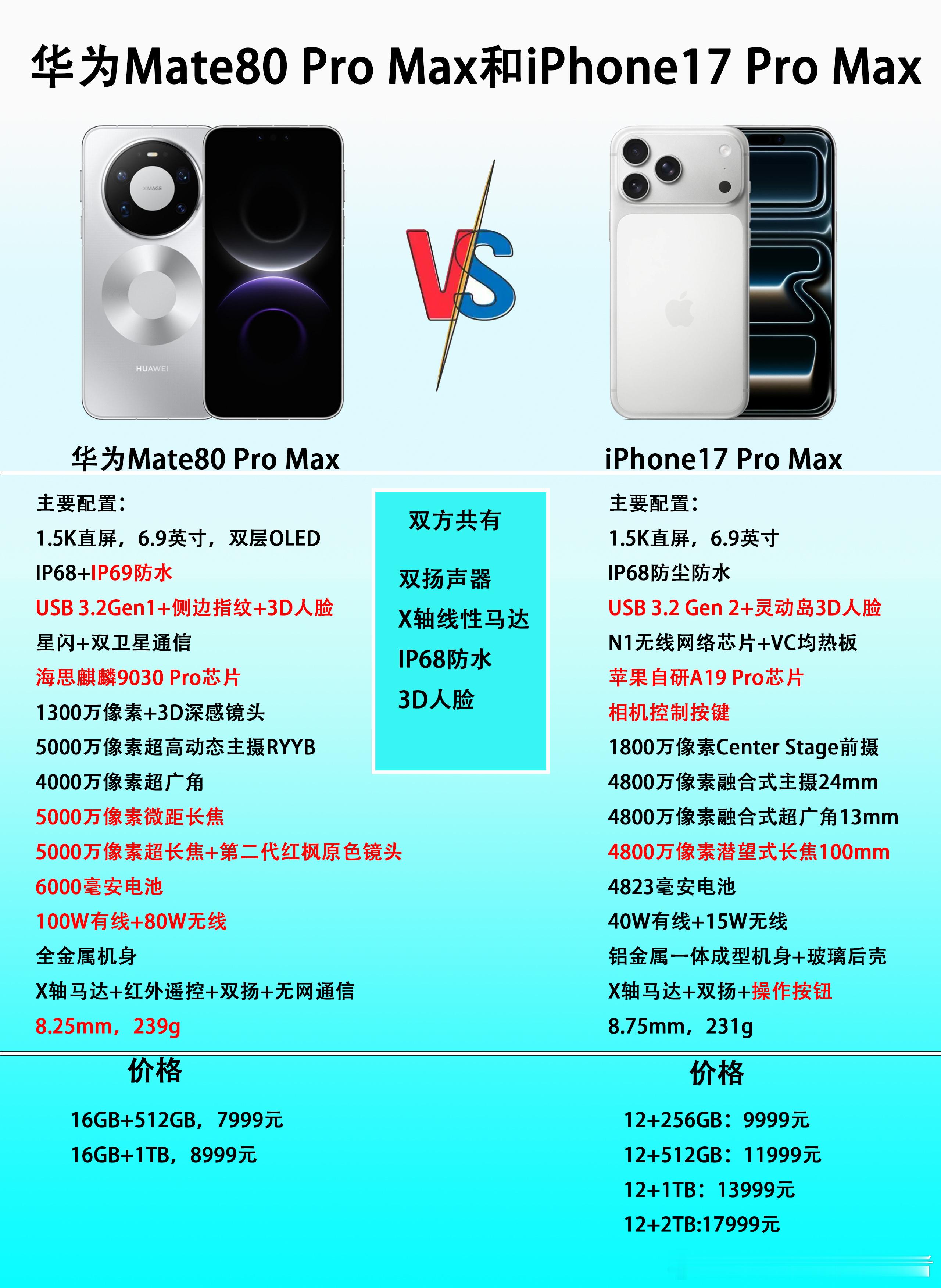 高端手机之间的对决,华为Mate80 Pro Max和iPhone17 Pro Max该怎么选?有很多网友问,想买一台高端旗舰手机,价格控制在一万元以内,自己不想用安卓,想在华为和苹果之间选一款,这样看,只有华为Mate80 Pro Max和iPhone17 Pro Max合适。先来说个结论,如果追求可玩性、对信号和价格比较在意,个人更推荐华为Mate80 Pro Max;如果是对性能有更高的要求、对系统生态有一定要求,那么直接选择iPhone17 Pro Max就行。华为Mate80 Pro Max的配置给的很足,比如双层OLED屏幕、双潜望式长焦;更大的6000毫安电池以及更快的百瓦快充和80W无线充电等等。它的优势就是硬件很强,日常拍照也非常不错。全金属机身质感和手感都挺好的,麒麟9030 Pro芯片搭配鸿蒙系统,流畅度没问题。短板就是目前鸿蒙系统处于发展阶段,可能在生态上不如苹果iPhone17 Pro Max的话就适合追求稳定性的用户,因为它的生态更完善,不知道怎么选的话默认直接苹果即可。它的A19 Pro芯片性能更强,视频录制能力行业顶级水平,续航也不错。硬件上也没啥问题。就是今年iOS 26口碑一般,Bug比较多,除了容易剐蹭掉漆外也没啥问题了。华为Mate80 Pro Max要更便宜一些,512GB版本7999元,1TB版本8999元,而iPhone17 Pro Max起步就是9999元。根据自己的需求决定就行,如果实在纠结就直接选iPhone;对价格和信号这些有需求,那选择华为就行了。
