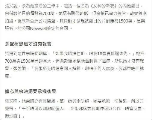 张柏芝庭审 答非所问 张 柏 芝 经 纪 人 合 同 是 假 的,公 章 是 假 的,连“患 癌”都 只 是 骗 取 同 情 的 工 具,这 种 情 况 下 逼 得 一 个 人 情 绪 崩 溃,才 有 答 非 所 问 的 行 为 出 现。张 柏 芝 前 经 纪 人 余 毓 兴 伪 造 公 章、冒 充 经 纪 人 签 合 同、用 悲 情 故 事 骗 取 原 谅、私 吞 800万 酬 劳…如 今 倒 打 一 耙 告 上 法 庭。张 柏 芝 待 人 以 诚,却 遭 连 环 算 计,换 谁 谁 不 崩 溃。。