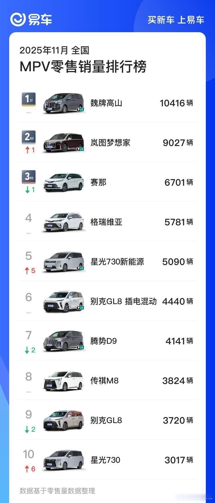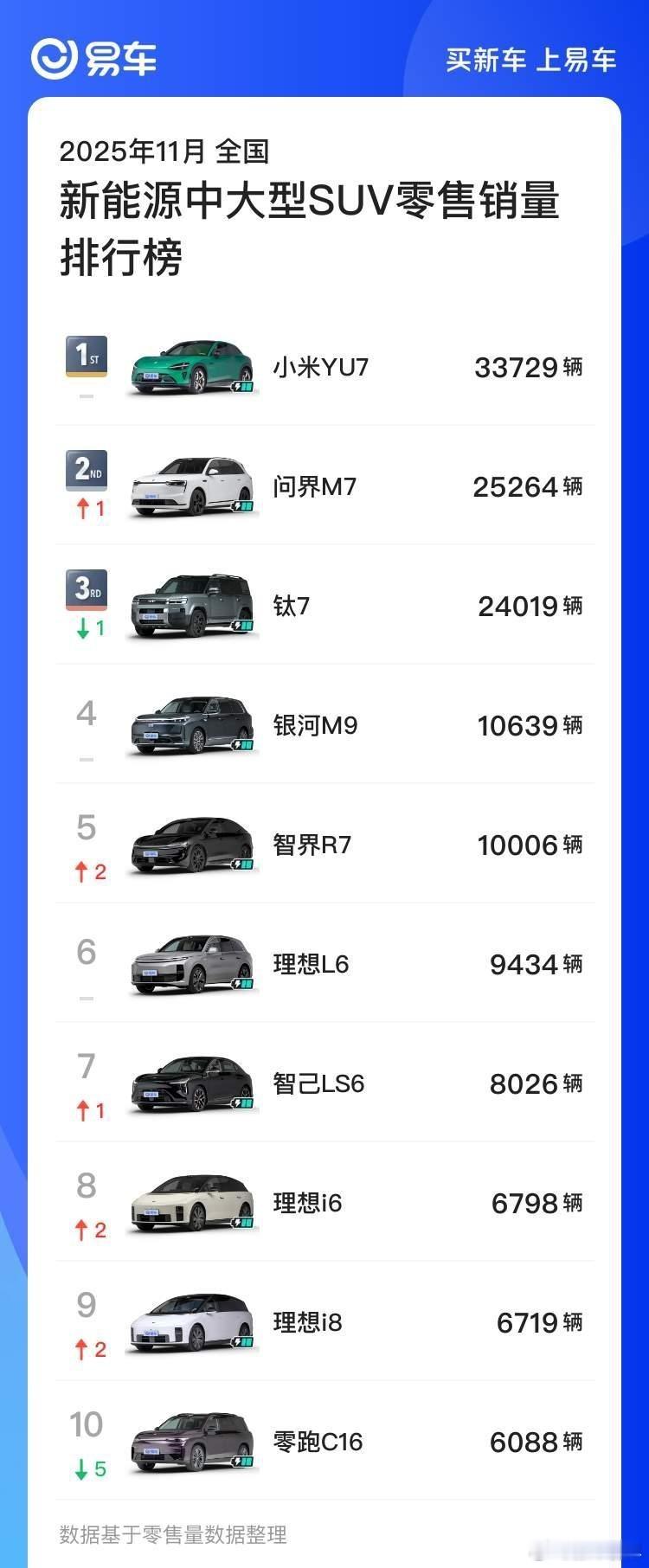 「11月零售端销量盘点」,有些统计逻辑还是有歧义,参考着看吧。-品牌榜,综合了「五界」的鸿蒙智行登顶,但是自有三个品牌的蔚来却没上榜;-中大型SUV,小米YU7第一,线下竞品Model Y是47132台;这里其实可以看一下理想i6和i8的销量,都在缓慢增长;-MPV,高山继续领跑,梦想家紧随其后,D9有点儿走下坡路的趋势。新能源汽车撩妹不如撩车