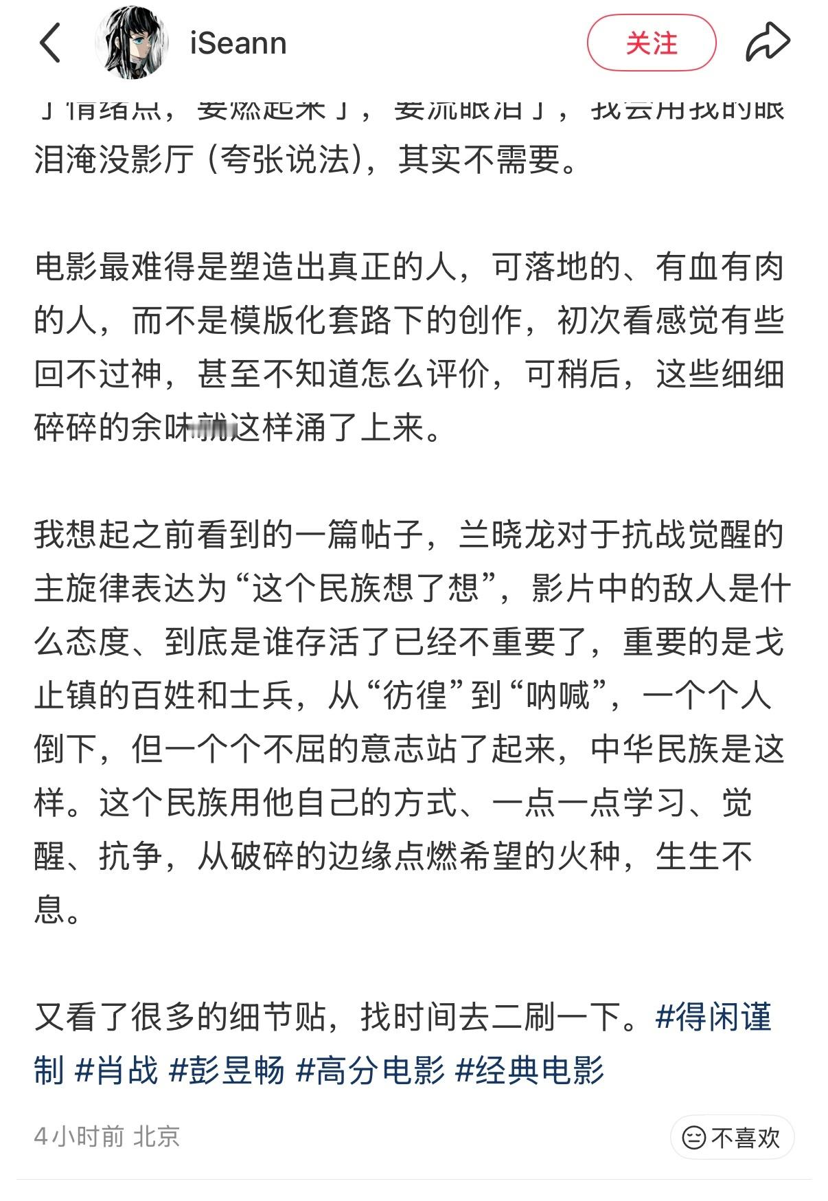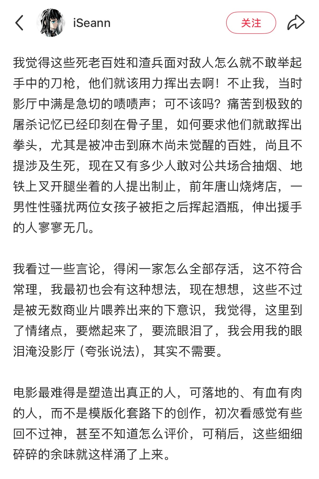 又发现一篇特别好的《得闲谨制》分析,我看到的几个差评,无一例外都是因为电影没有按照他觉得来拍摄,小孩和女性就应该待在家里不乱跑,村民就应该第一时间杀敌,老太爷就应该倒下狠赚一波眼泪,他们被大量套路化模板化喂养,反而不能适应突出桎梏真正有血有肉的人,而《得闲谨制》后劲儿这么大恰恰是因为,这电影里的每个角色是你也是我,你和我没有杀过人甚至没有杀过鸡,我们看到强敌第一时间第一反应也是逃避,直到避无可避才会选择反抗,“我们很难去评价一个与自己很像的角色和故事”,你以为你在看故事,其实你在看历史看过去也在看现在看未来,所以越品味越沉思 得闲谨制 得闲谨制票房是排片的两倍 得闲谨制票房