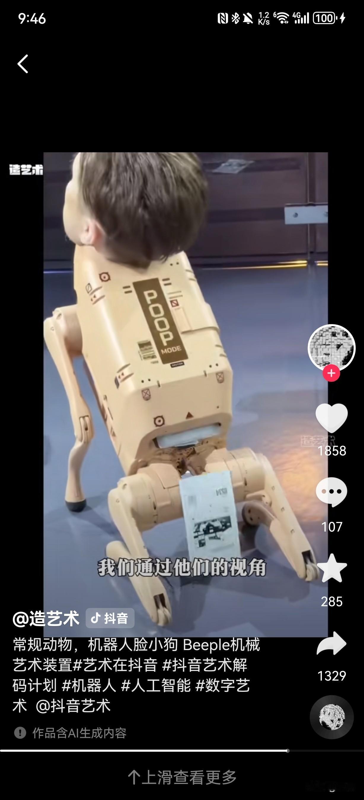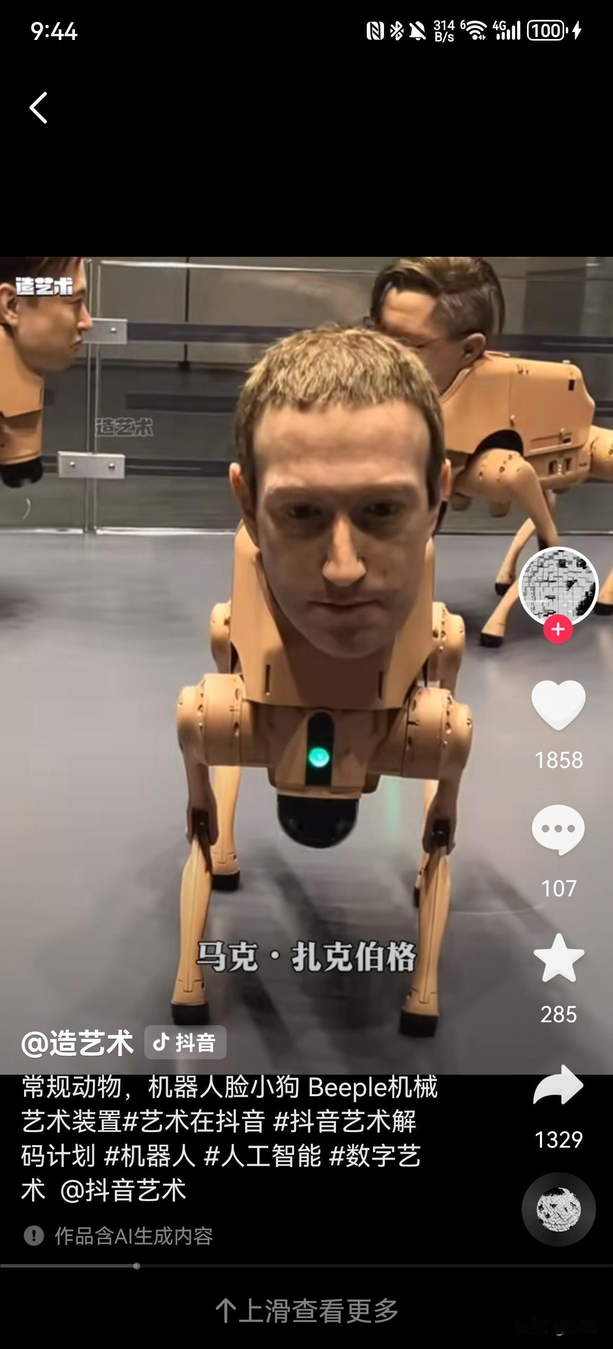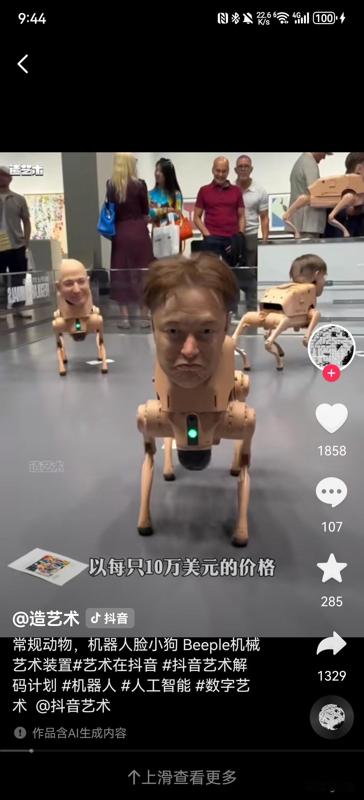 美国数字艺术家Beeple于2025年12月迈阿密海滩巴塞尔艺术展上推出的《常规动物》(Regular Animals)作品。作品核心是一批搭载超写实头部的机器狗,头部形象涵盖马斯克、贝佐斯、扎克伯格等科技巨头,毕加索、沃霍尔等艺术大师,还有Beeple本人及谷歌联合创始人谢尔盖·布林等商界精英。这些机器狗会在展厅围栏内自主游荡、躲避障碍并拍摄参观者,还能从尾部“排泄”出带对应人物风格的打印照片,比如马斯克款是黑白滤镜,毕加索款是立体主义风格,扎克伯格款则有元宇宙美学特质。特别的是,贝佐斯款机器狗被设定为“只看不拉”,且所有机器狗以每只10万美元的价格售罄,买家需允许作品继续巡展。
