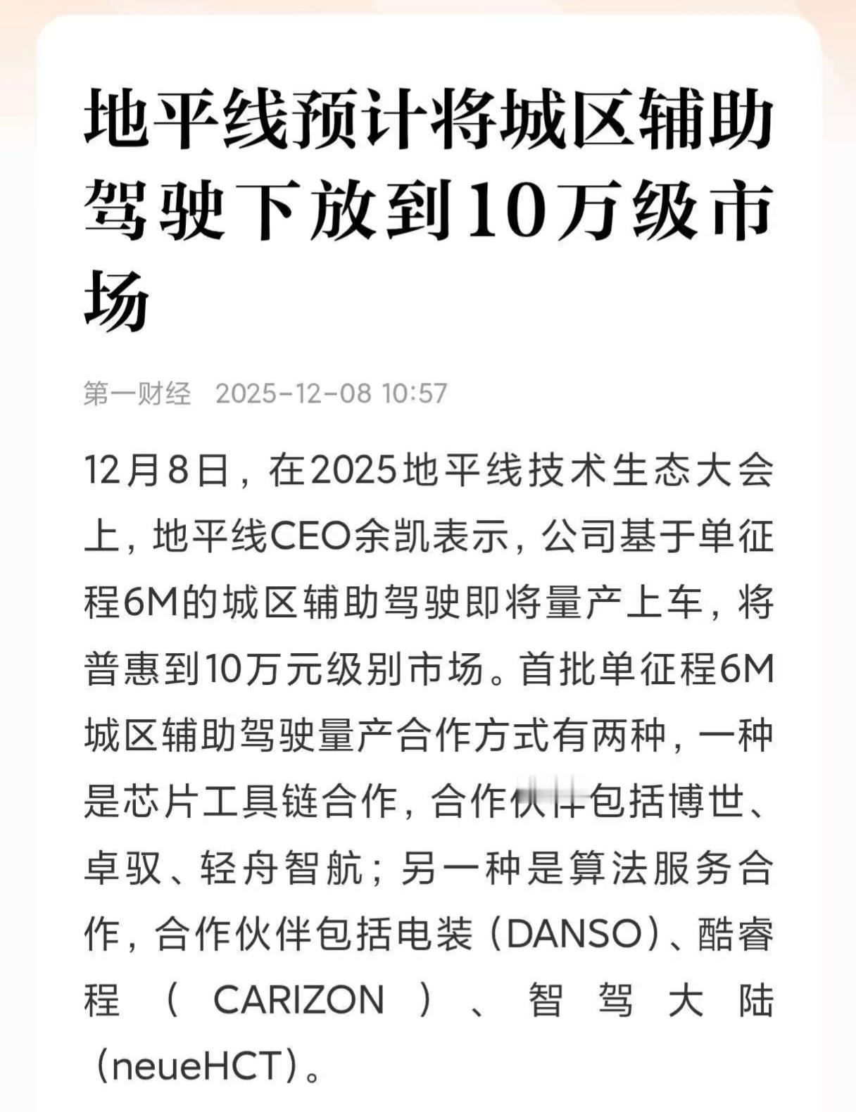 我之前以为比亚迪什么的才能普及全民智驾,现在看来这事还得供应商,你想想啊,主机厂车型覆盖那么多,如果功能上差异不大,那我干嘛买贵的?并且智驾还不同于别的功能,你即便再廉价,也不能说随便就出现危险,所以像比亚迪、吉利……都好,但就是短时间不会给低端车型开放城区智驾,开放了就直接影响高端车型,所以只有供应商才可以普及智驾,先是搭载MMT的丰田铂智,现在又有搭载HSD的奇瑞星途,十几万的车都有城区智驾,并且还都不赖,现在还要打到10万左右