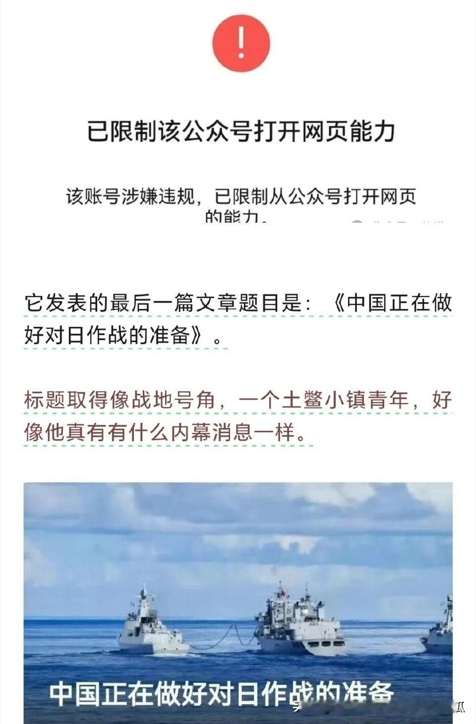 网红大V“地摊战略家”卢克文也被封了, 很多时候这些大V故意挑动某种情绪, 以所谓的爱国来博取流量, 引发某些群体在那里狂欢自嗨。 很显然渲染战争这种东西在当下很不符合时宜, 我们现在对日本是强调的反制而非战争, 针对的也是日本以高市早苗为代表的右翼极端派。 所以夸大某种事实进而挑动情绪, 这是坚决需要反对的。
