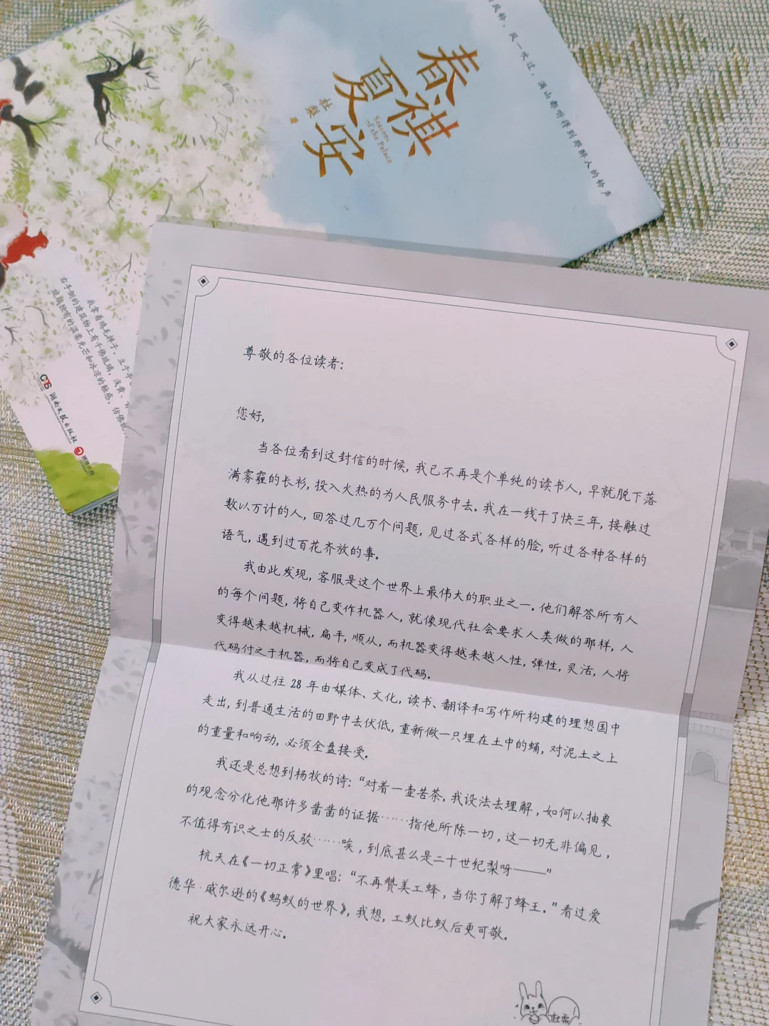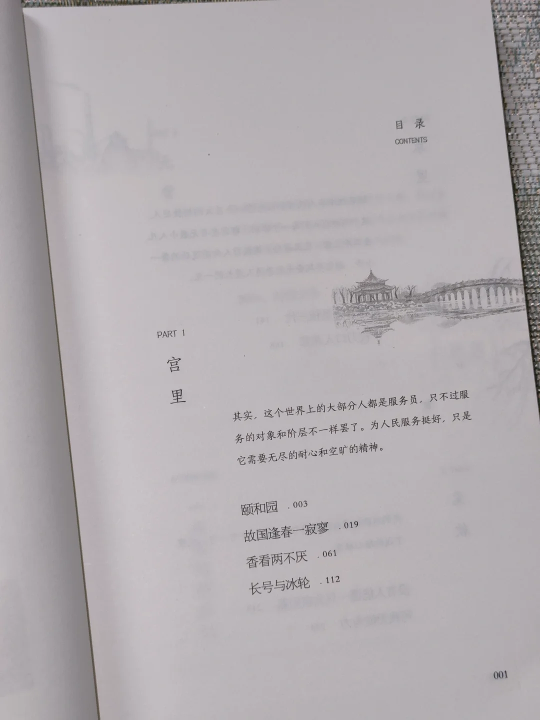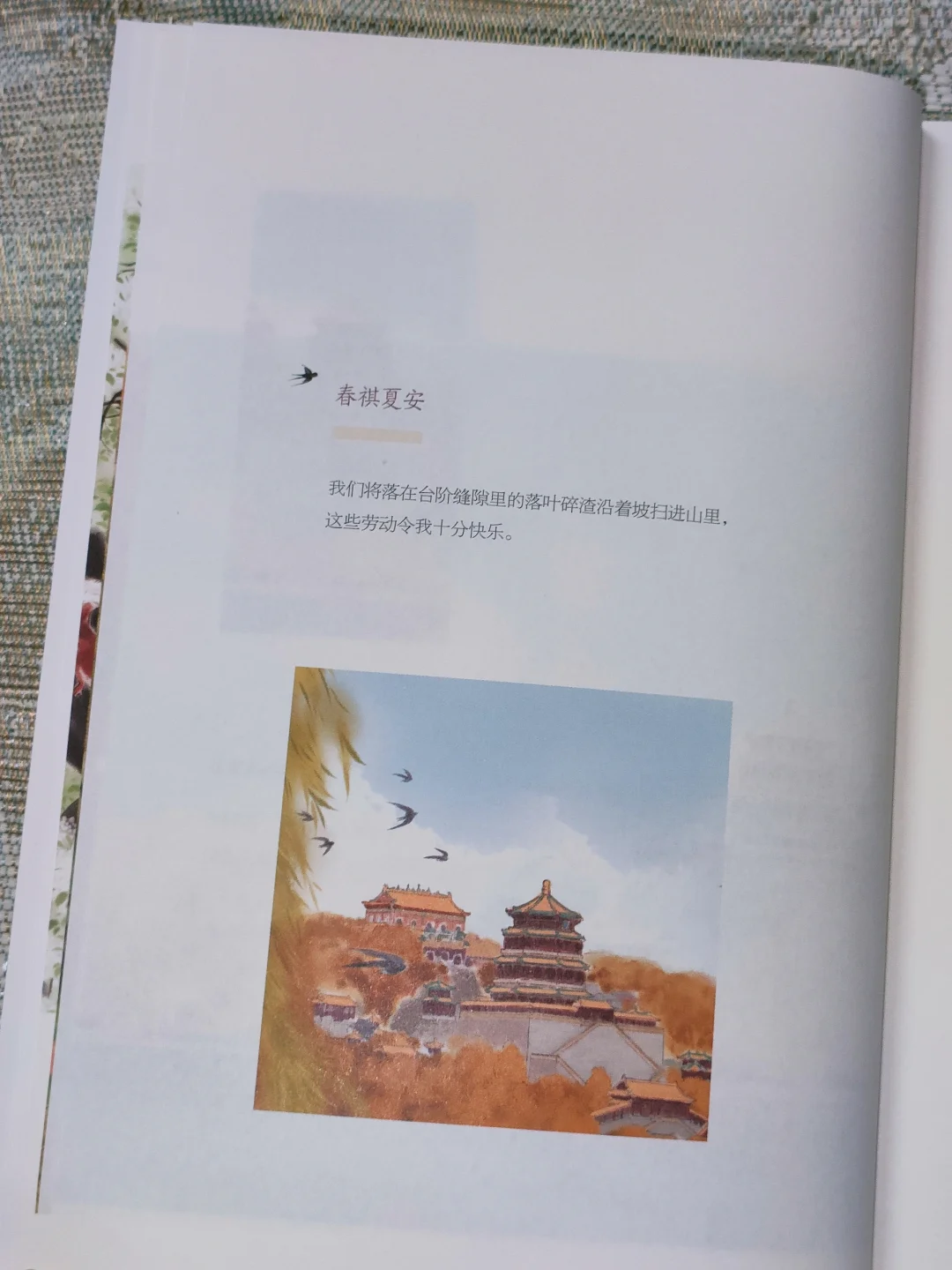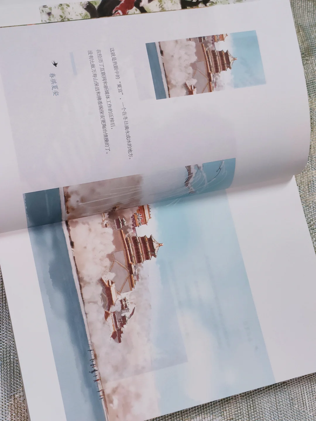 “我拿着鸡毛掸子,立于亭台之上,扶栏眺望。右手侧的建筑物上有千佛琉璃,浅黄、青瓜绿和柔紫,琉璃独 有的温柔光芒和冰凉的触感,仿佛就在鼻尖。”