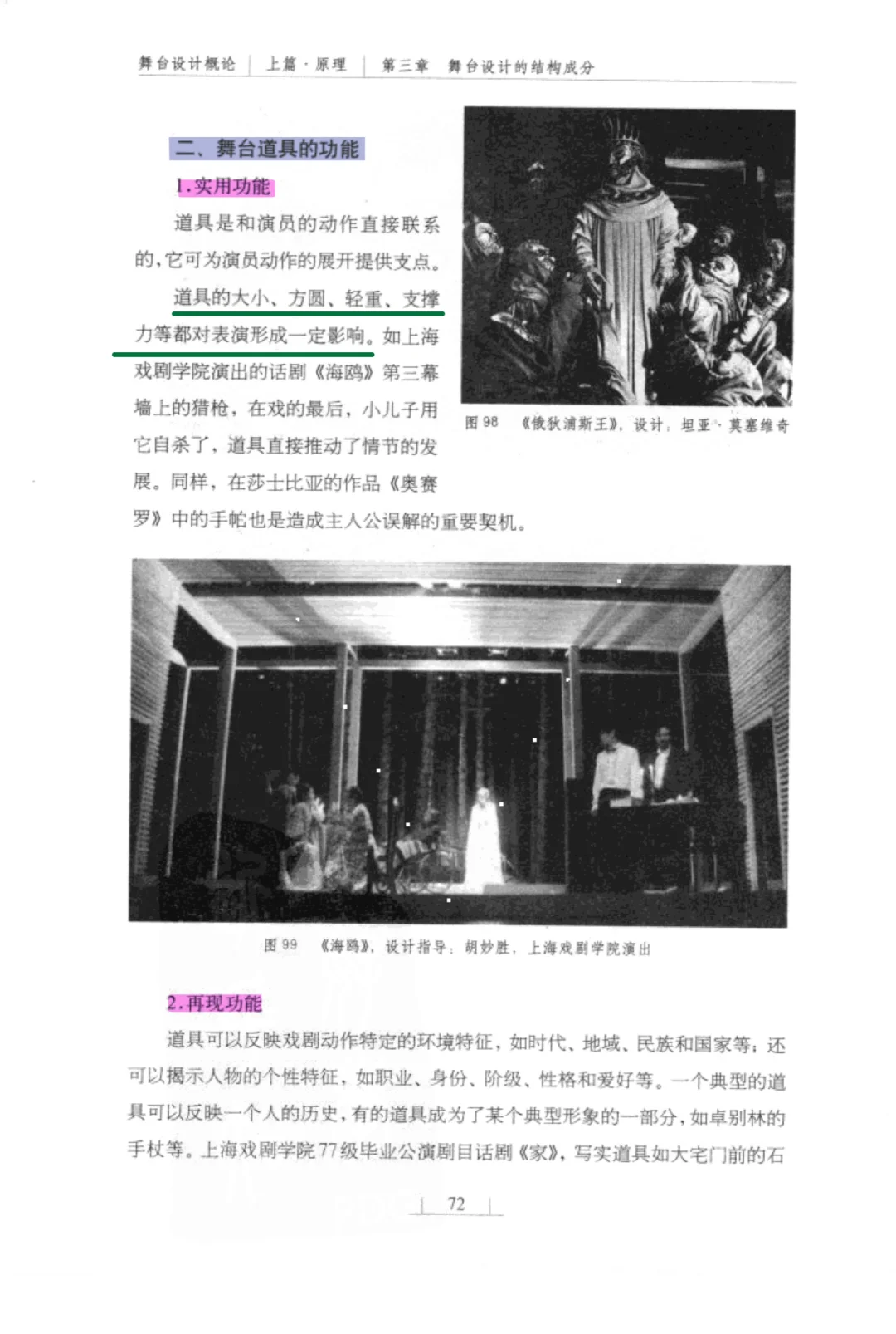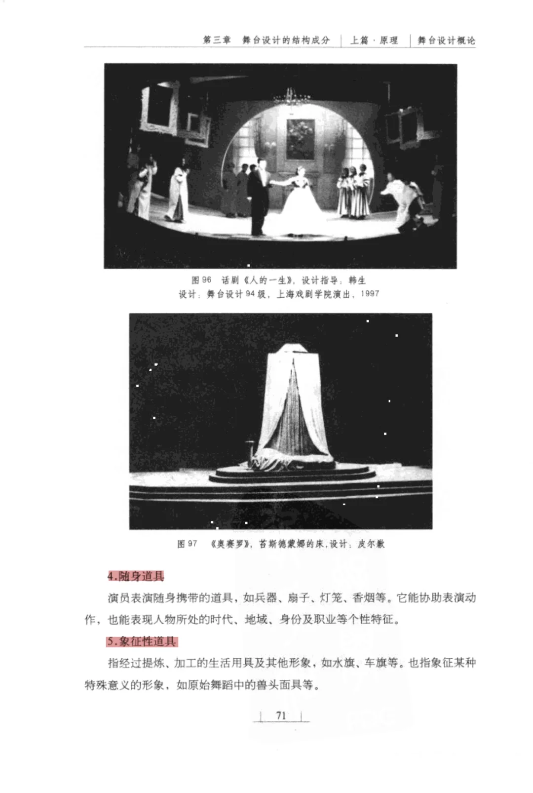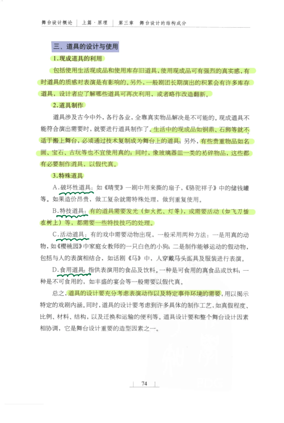 总之,道具的设计要充分考虑表演动作以及特定事件环境的需要,用以揭示特定的戏剧内涵。同时,道具的设计要考虑到许多具体的制作工艺,如真假程度、比例、材料、结构,以及迁换和运输的便利等。道具设计要和整个舞合设计因素相协调,它是舞台设计重要的造型因素之一。素材源自《舞台设计概论》