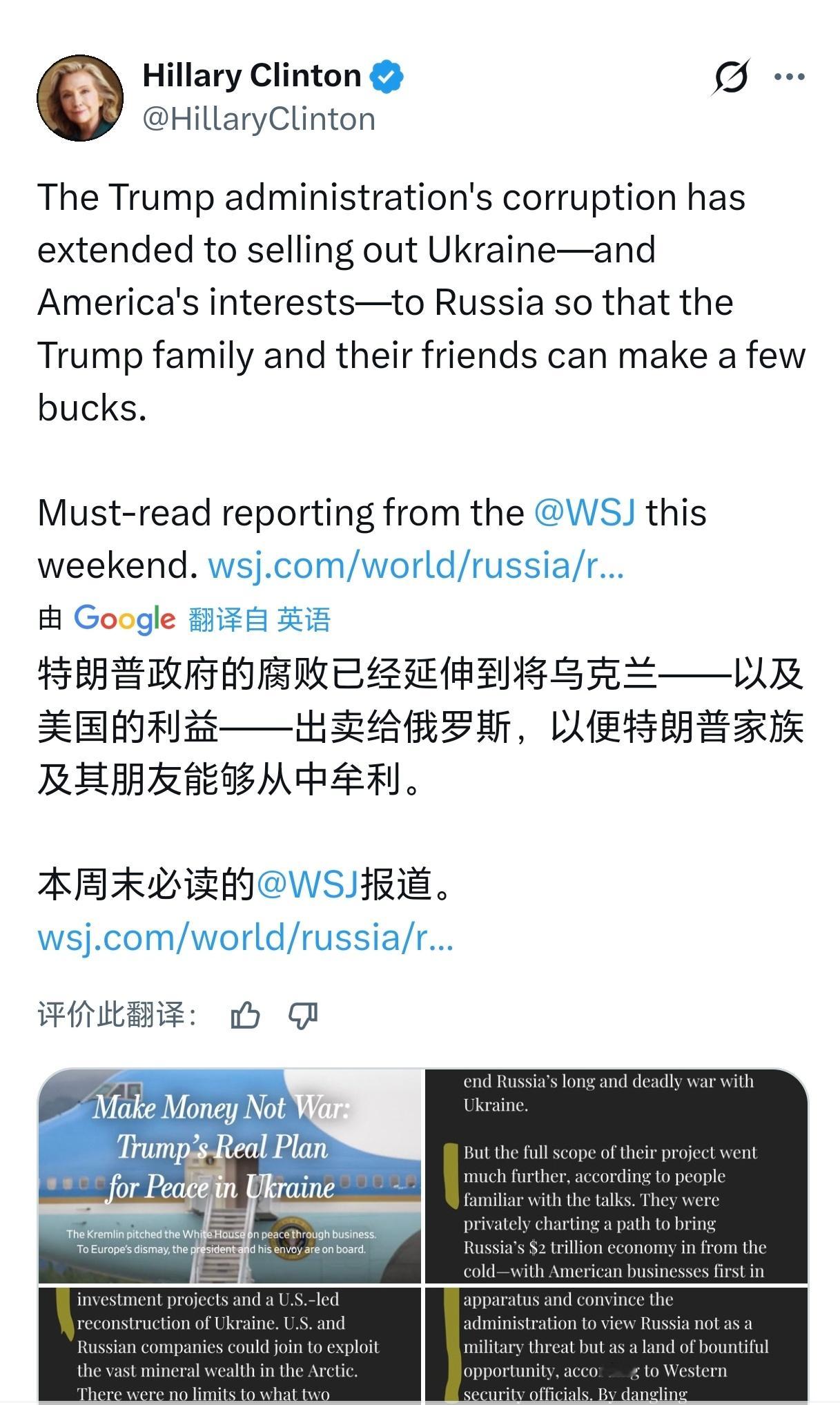 希拉里:特朗普把乌克兰卖了,把美国也卖了乌将美和平计划比作慕尼黑协定