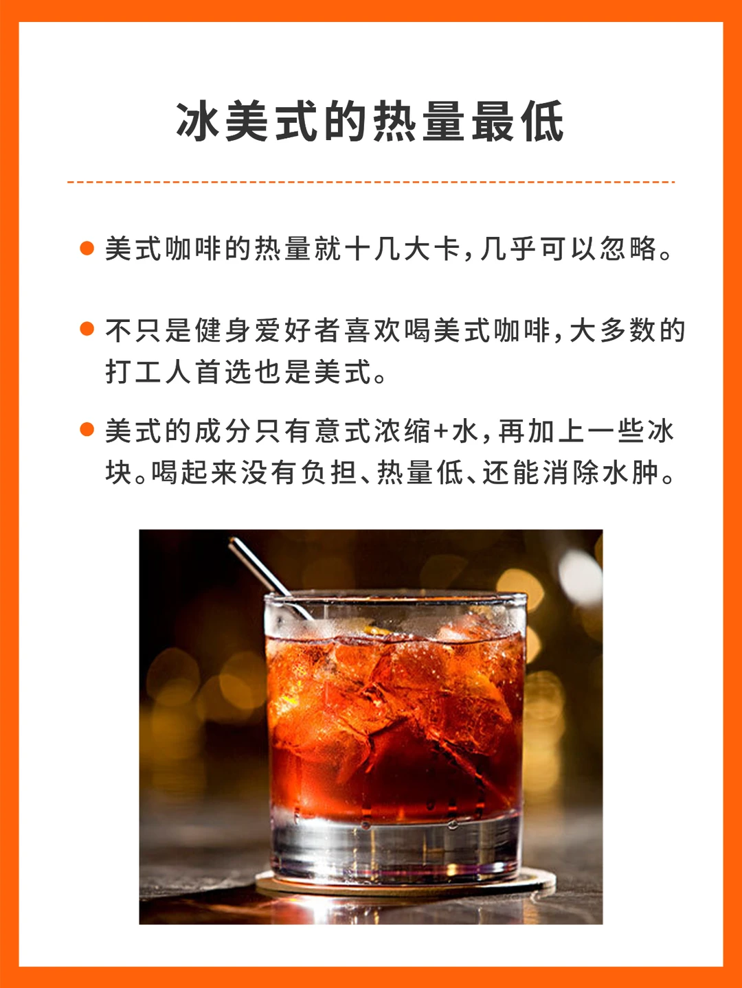 咖啡的好处虽然很多,但是种类也很丰富。 但为什么偏偏钟爱冰美式呢? 👇举个栗子就知道啦 一杯摩卡热量大概是350大卡,一杯无糖拿铁热量大概是150大卡。而一杯美式热量大概是15卡。而且除了热量低,还能增加新陈代谢、增加运动持久性,提升减肥效果