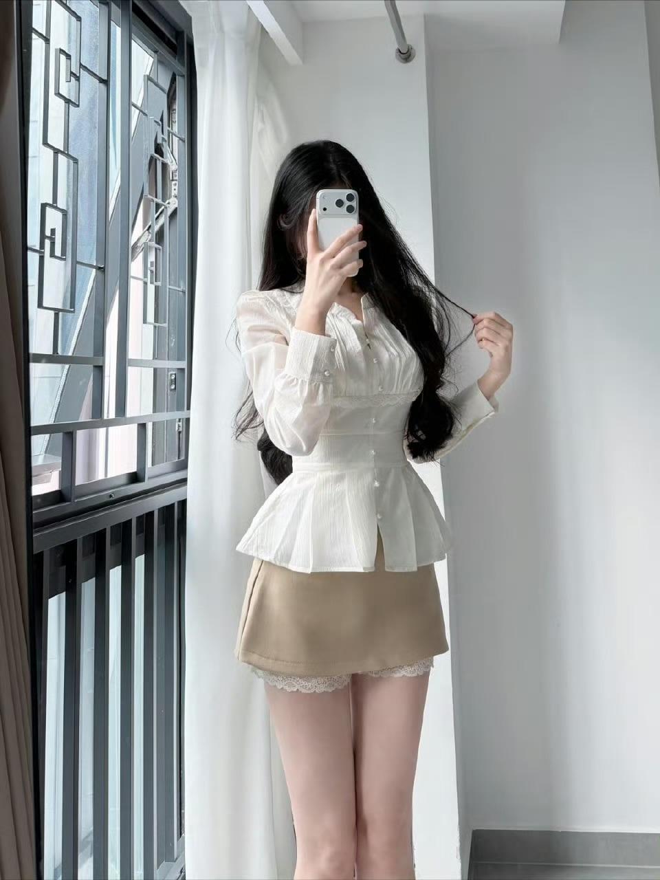 今天这套“宫廷风收腰衬衫+短款卡其裙”也太藏肉了!微透面料+蕾丝内搭小心机,阳台自然光一拍就出片,你们猜这衬衫多少斤能穿? 复古衬衫裙穿搭 法式衬衫套装裙