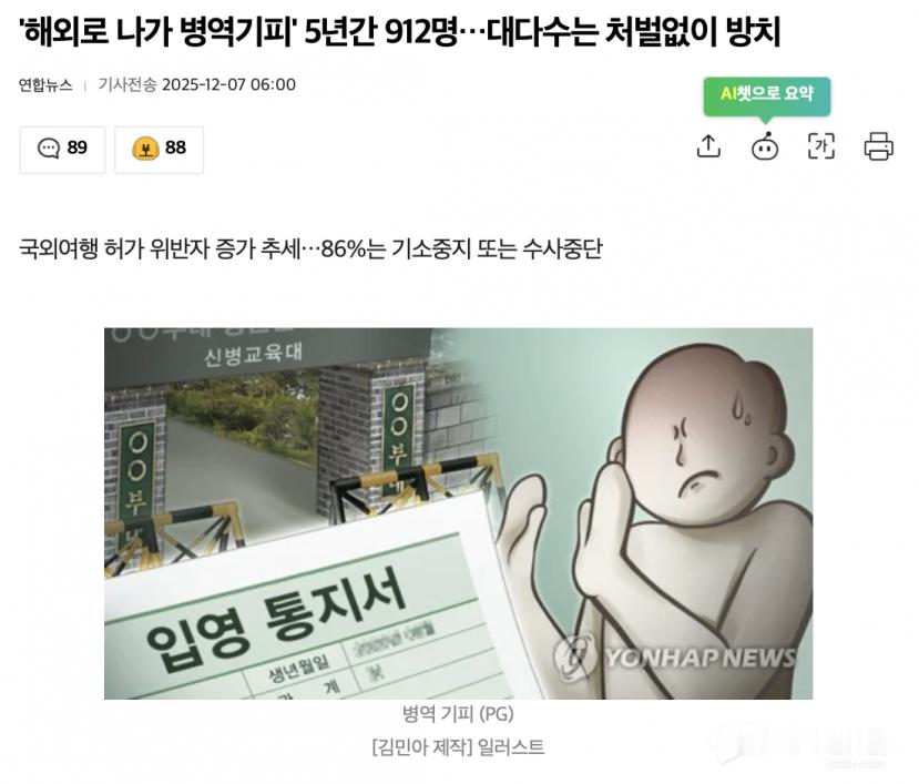 【韩国过去五年“出国逃避兵役”者达912人…多数未受处罚】海外新鲜事热点现场 韩国近期通过海外长期滞留方式规避兵役义务的案例呈持续增长趋势。国会国防委员会成员黄熙议员7日公布的数据显示,过去五年内因“出国后不回国”方式逃避兵役的人数累计达到912名,不过其中大部分案件因嫌疑人长期在海外而处于“调查中止”状态。根据黄议员从兵务厅获得的资料,自2021年至今年10月底,共有3,127人被认定为兵役义务逃避者。其中,拒绝入伍者1,232人(39.4%)最多,其次是违反“海外旅行许可义务”的912人(29.2%)、拒绝接受兵役体检的586人(18.7%),以及拒不参加社会服务召集的397人(12.7%)。按照《兵役法》,未履行兵役的25岁以上韩国男性若希望出国旅行或长期滞留,必须事先获得兵务厅的“海外旅行许可”。若无法在许可期限内回国,应在期限到期前15天提出延长申请。此外,24岁以前已出境且25岁以后继续滞留海外的,也必须通过驻外使领馆获得许可。对无视规定者,兵务厅会以违法行为进行刑事控告,同时限制其在37岁之前获得护照,并在网站上公开身份信息。自去年7月法律修改后,兵务厅特别司法警察还可以直接展开调查。不过违规案例仍持续增加。违反“海外旅行许可义务”的人数从2021年的158人增至2024年的197人(截至10月已有176人)。其中,多数属于“以短期旅游为理由出国后未按期返回”的情况,共648人,占比71.1%。尽管如此,相关案件的处罚比例极低。在912名违规者中,真正完成刑事处理的仅48人(6人被判监禁、17人缓刑、25人被检方不起诉处理);其余780人(85.5%)均处于“起诉中止或调查中断”阶段。兵务厅表示,由于此类案件的调查需本人回国才能进行,导致大部分案件无法推进。相比之下,在国内拒服兵役的案例中,61.2%最终被判处监禁或缓刑,执法效果显著不同。韩国黄熙议员指出,为防止以海外滞留形式规避兵役,政府需加强兵务厅、外交部及法务部之间的协作机制,制定跨部门对策。