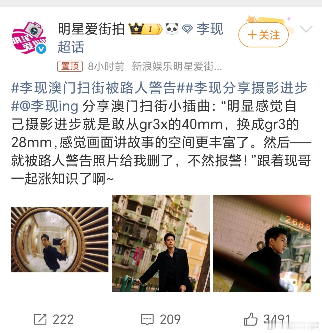 李现澳门扫街被路人警告李现感觉现在活得好真实爆火之后也一直有着不错的作品输出而且还找到了自己的兴趣(摄影)这次居然带着理光GR3去扫街了,不再是长枪大炮了,结果一查才知道原来李现在2020年就成为了理光GR的全球代言人!!有点意思,手机圈真我品牌也是和理光GR联名