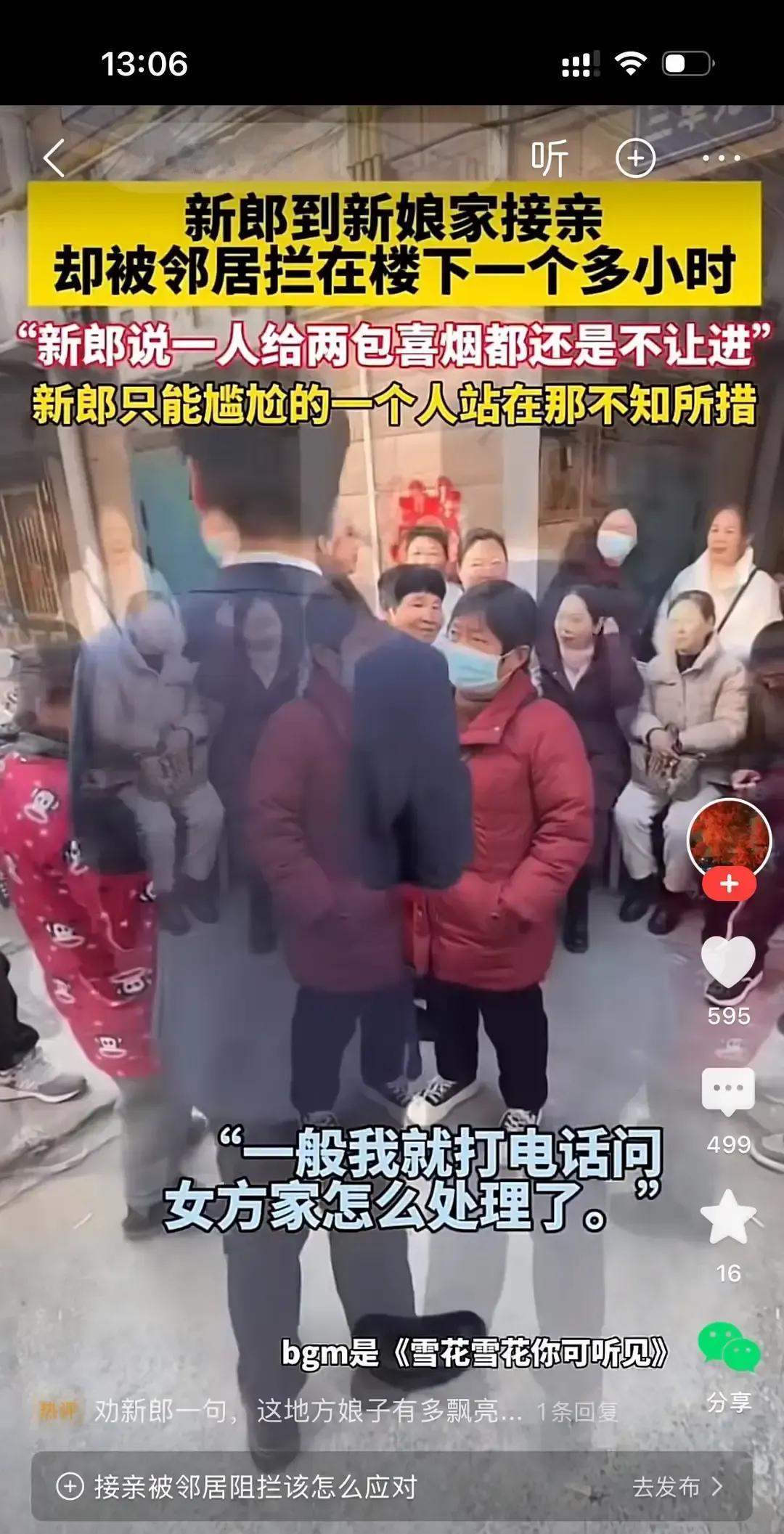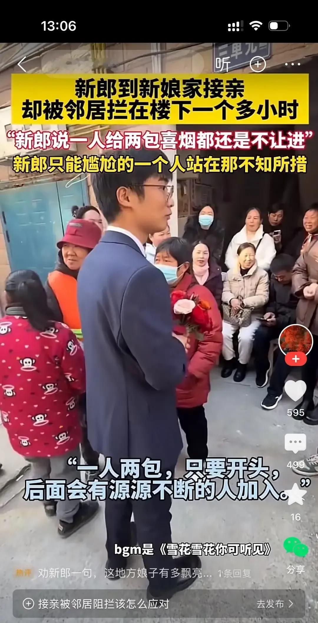 新郎拎着喜糖刚走到单元口,就被七八个邻居堵成一道人墙,张嘴就要一人一包烟。 他笑着拆了两条,挨个递,烟盒空了还有人伸手,说没抽到就是不给面子,硬把楼道口当收费站。 新娘家在五楼,他愣是被晾在原地一个多小时,伴郎嗓子喊哑,喜糖撒了一地,最后只能报警才把人接出来。 喜事变闹剧,图彩头成了明抢,谁还笑得出来。 婚俗不是挡财的遮羞布,想热闹可以,先把尊重放第一。