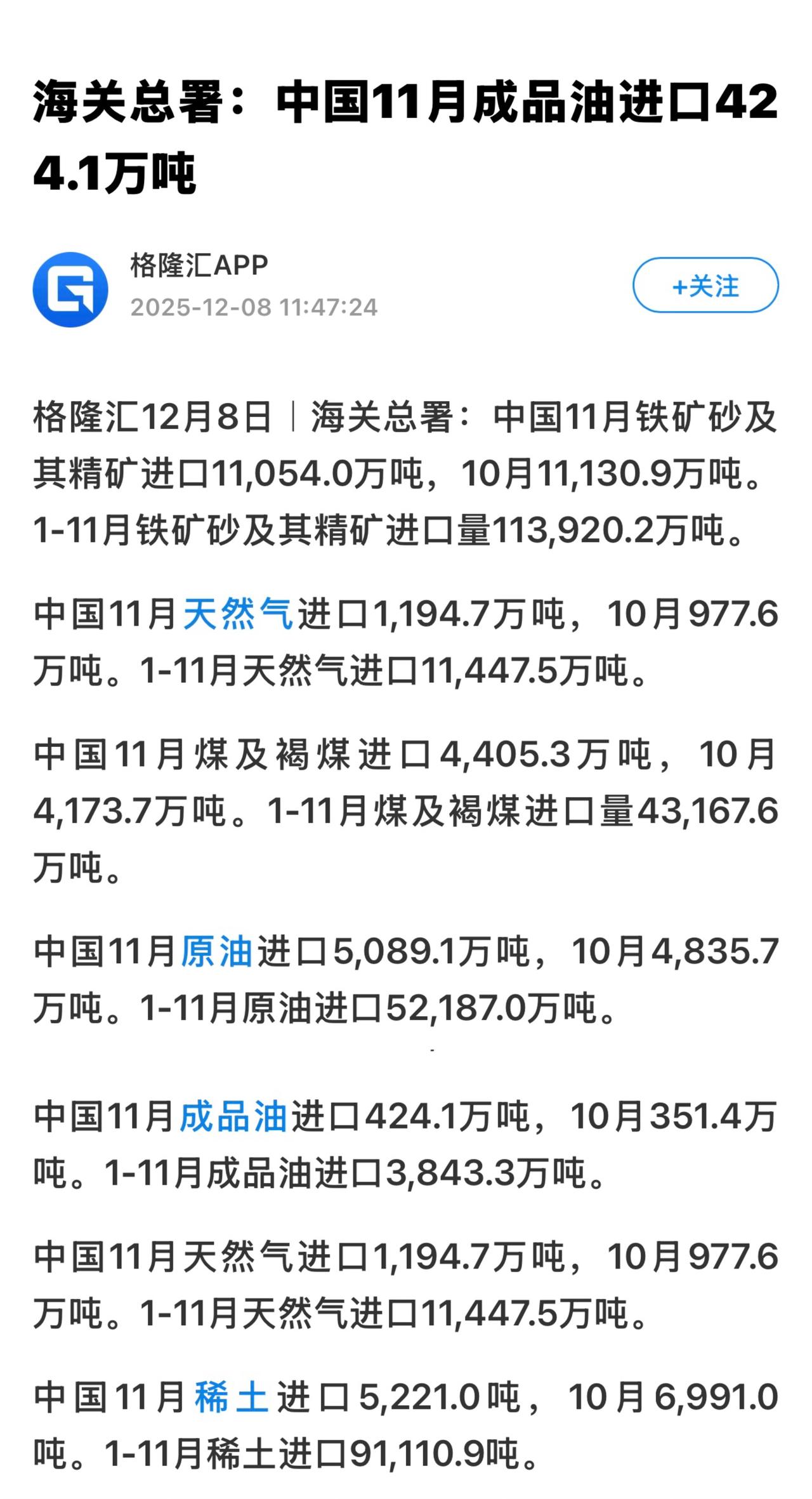 中国11月原油日均进口量创27个月新高 数据显示,中国11月原油日均进口量达每日1238万桶,创下2023年8月以来的最高水平。