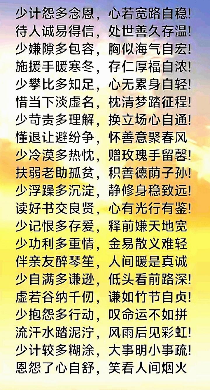 人生少去论高低 盲目攀比徒自欺 他人富贵由他去 自家安稳胜锦衣 三餐温饱心知足 啥都不如好身体 恩怨是非少纠缠 相逢一笑化冰寒 鸡毛琐事随它去 斤斤计较心不安 闲言碎语耳边过 莫把烦恼放心田 看淡得失天地宽 少去争抢心自安 世事纷扰终有定 顺其自然路平坦 宽宏大量容万物 笑对人生每一天