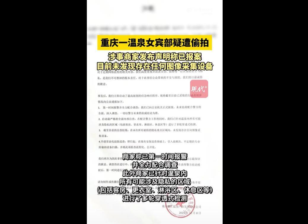 近日重庆一温泉卷入偷拍风波,网友发布含该温泉标识的非正常视角室内画面,称大量女宾入浴疑似被偷拍。 温泉方回应已报警并全力配合调查,对客房、更衣室等隐私区域开展多轮穿透式自查,称未发现图像采集设备,后续将升级专业防偷拍巡查并公开流程。 网友质疑自查可信度,担忧偷拍设备已被撤走,联想到过往偷拍团伙作案案例,呼吁警方彻查产业链,要求商家落实实质性防偷拍措施。 这事儿简直恶心到骨子里!女宾更衣室是最私密的地方,网传有偷拍画面,换谁不得留下心理阴影? 温泉方说自查没找到设备,可视频里明晃晃有自家标识,这说辞也太苍白了 —— 偷拍的本来就会偷偷装、及时撤,自己查跟 “自说自话” 有啥区别? 消费者花了钱是来享受的,不是来给人当 “拍摄素材” 的! 商家光喊口号没用,自查根本不靠谱,得请第三方专业机构来查,把检查流程、结果全公开,让大家看得见才叫放心。 警方更得下狠劲,不光要揪出偷拍的人,还得顺藤摸瓜打掉整个偷拍产业链,不然上千人受害的悲剧还会重演! 隐私保护不是嘴上功夫,温泉行业早该敲响警钟了! 装修时就得做反偷拍设计,日常巡查不能省,法律更得从重严惩,让偷拍者付出惨痛代价。 要是连最基本的隐私都保障不了,再有名的温泉也得凉,谁还敢来消费?