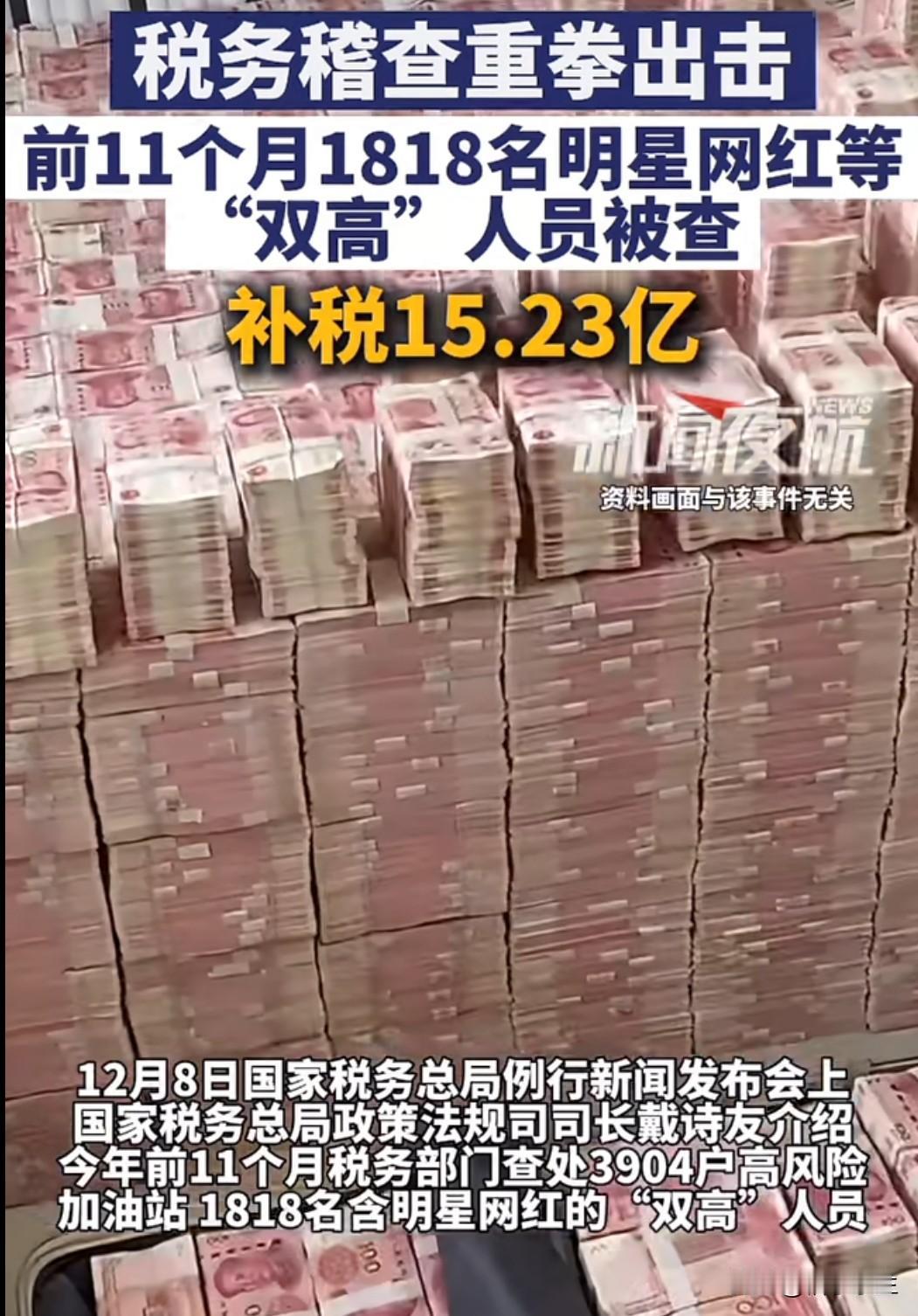 今年以来,已有1818名包括明星网红在内的"双高"人员被查处,补税款超过15亿元!这个数字真是触目惊心。 说实话,看到这些"日进斗金"的明星网红偷税漏税,普通老百姓心里肯定不平衡。这次大规模查处,彰显了国家整治娱乐圈税收乱象的决心。不过,光靠事后追缴还不够,还得建立长效机制,让这些高收入者不敢逃税、不能逃税。你觉得这次整治能彻底扭转娱乐圈的歪风邪气吗?