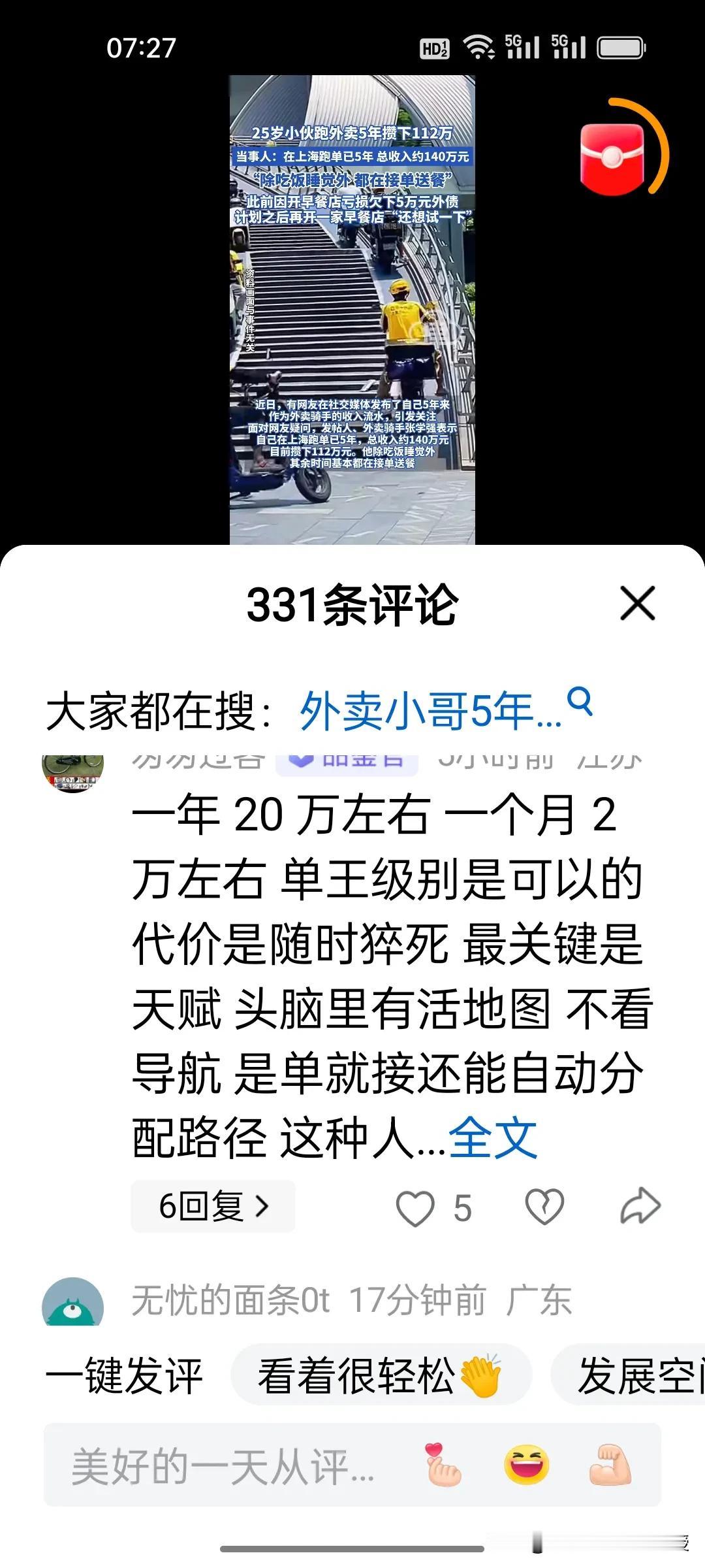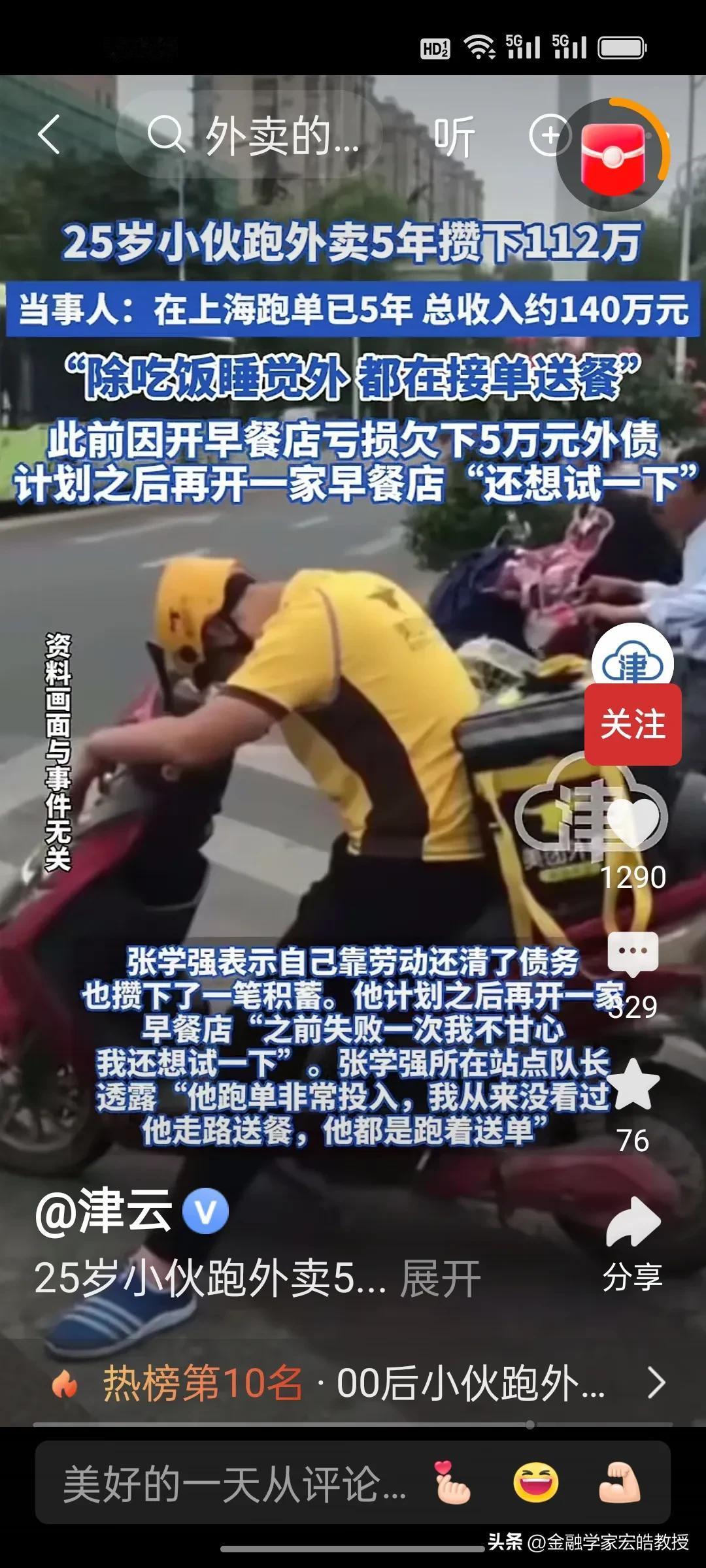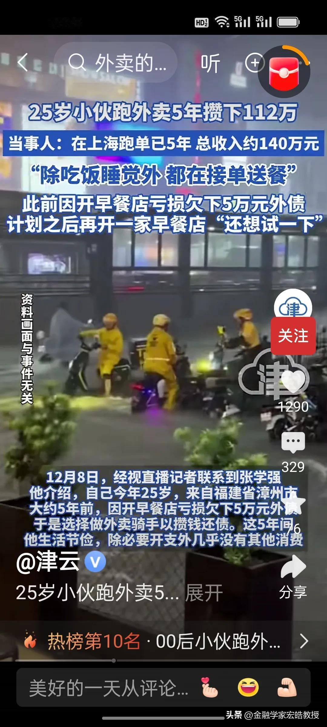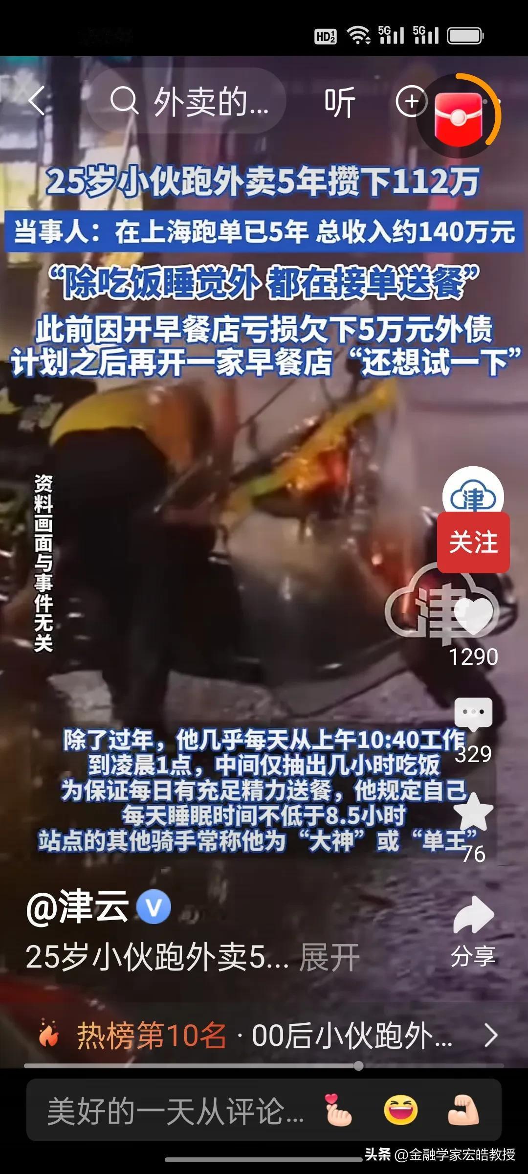 福建25岁小伙在上海跑外卖5年赚140万,一年挣28万,一个月挣2.3万,秒杀99%的打工人。最近一支关于阿岚从设计师到女外卖员还能看风景买单反拍照的公益广告下架了,被指不接地气,接着我们就看到了跑外卖能致富的鲜活案例。 特地查了一下北京的普通全职骑手的月收入情况,基本到手6000-9000元/月,日均40-50单,含基础提成+补贴。想要做到平均一个月挣到2.3万,还能像这位小伙一样每天睡8.5小时,难度系数很大啊!
