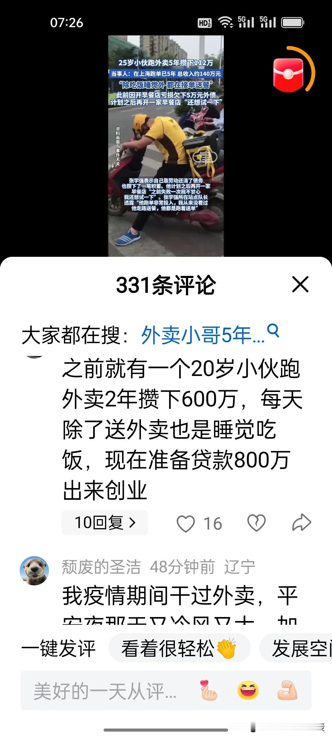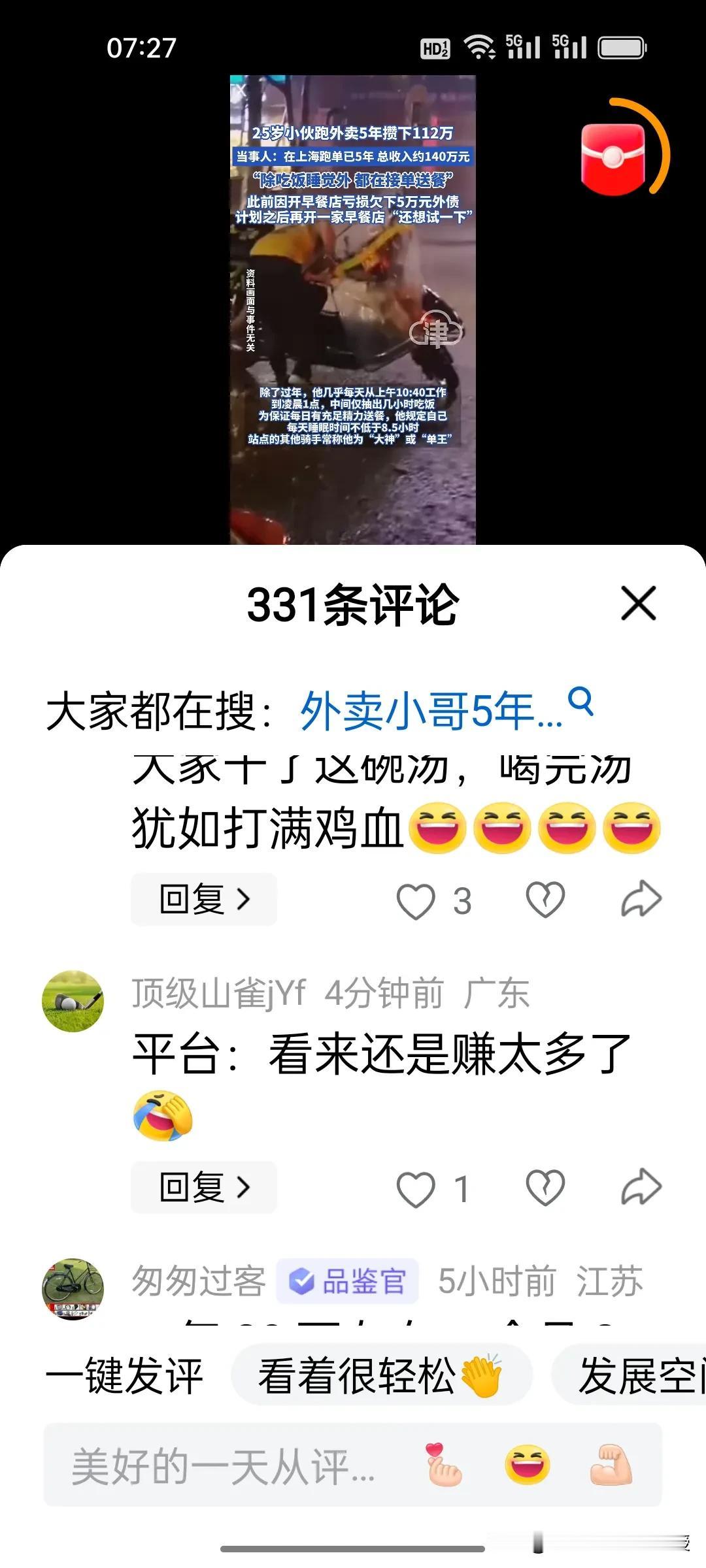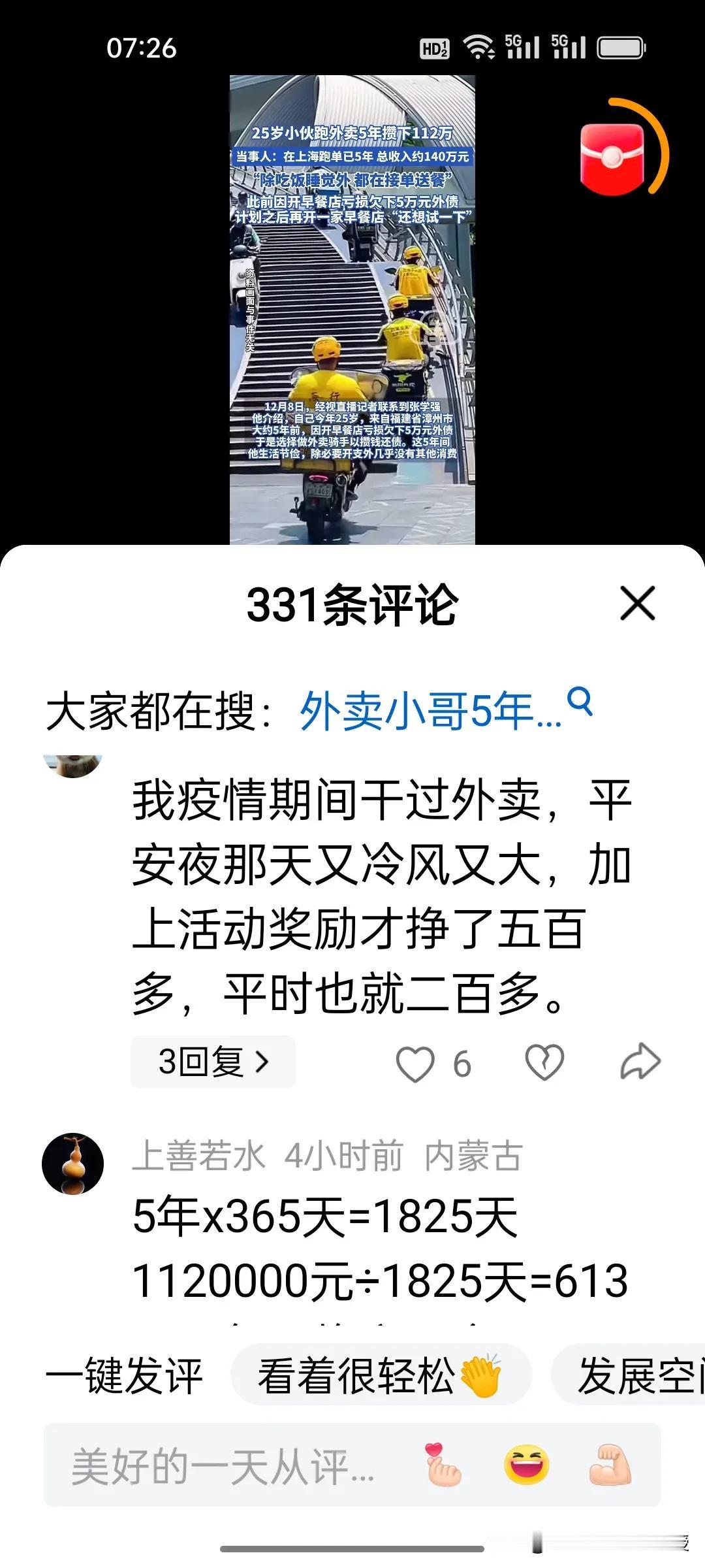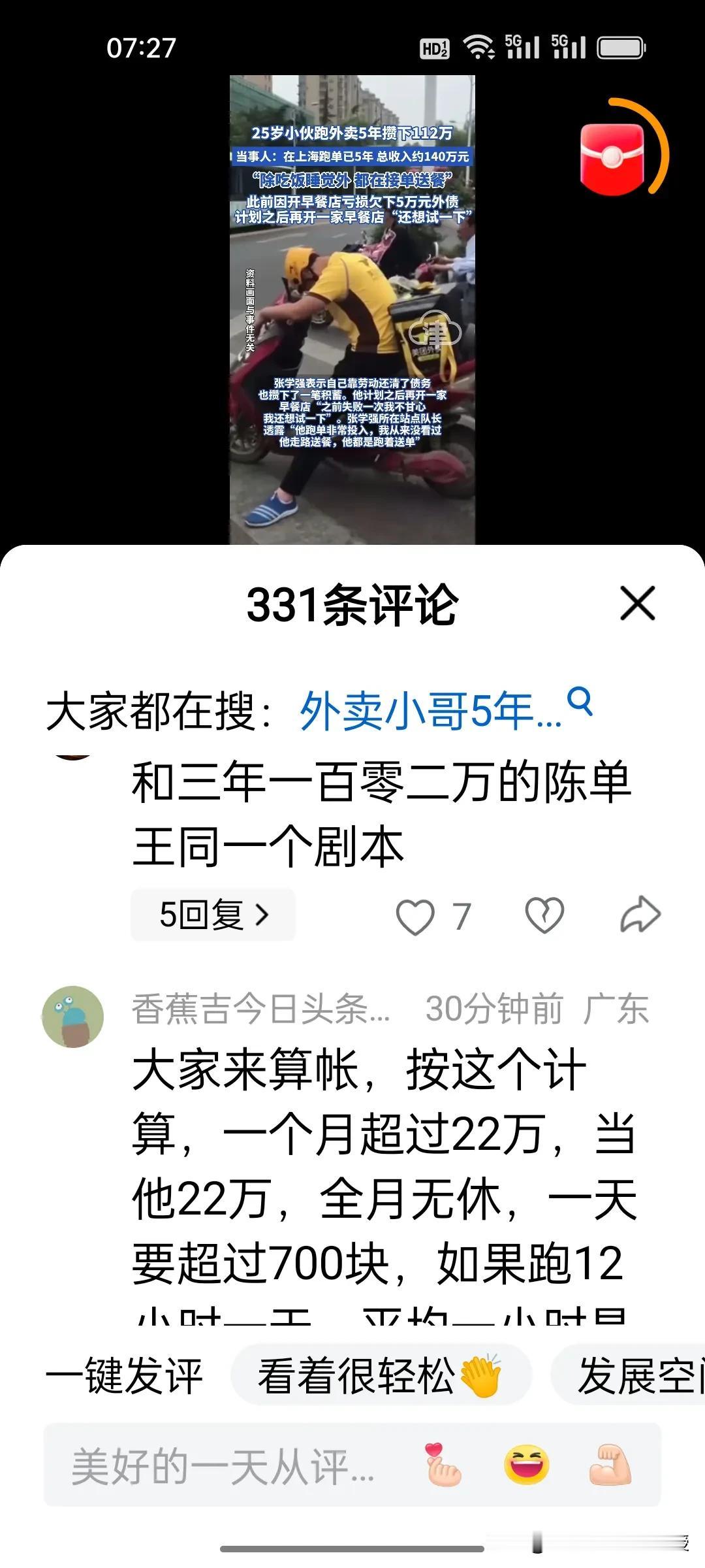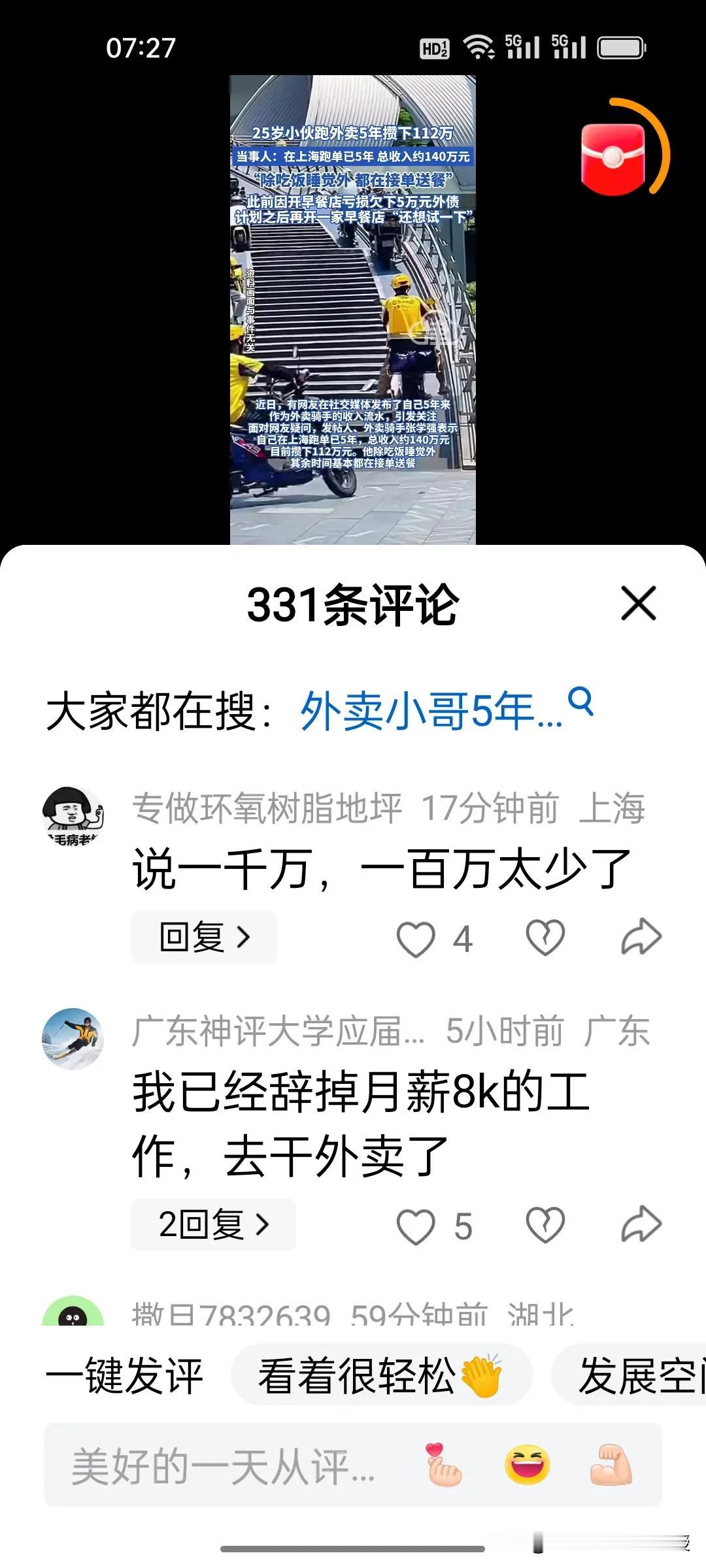 福建25岁小伙在上海跑外卖5年赚140万,一年挣28万,一个月挣2.3万,秒杀99%的打工人。最近一支关于阿岚从设计师到女外卖员还能看风景买单反拍照的公益广告下架了,被指不接地气,接着我们就看到了跑外卖能致富的鲜活案例。 特地查了一下北京的普通全职骑手的月收入情况,基本到手6000-9000元/月,日均40-50单,含基础提成+补贴。想要做到平均一个月挣到2.3万,还能像这位小伙一样每天睡8.5小时,难度系数很大啊!