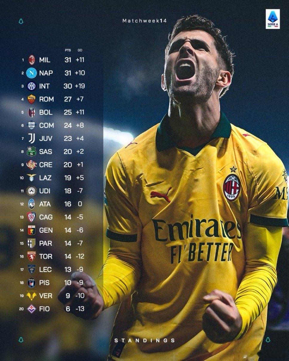14轮战罢 意甲积分榜如下都灵2比3ac米兰国际米兰4比0科莫热点解读 国米30分继续排名积分榜第3和身后球队的积分差距在扩大