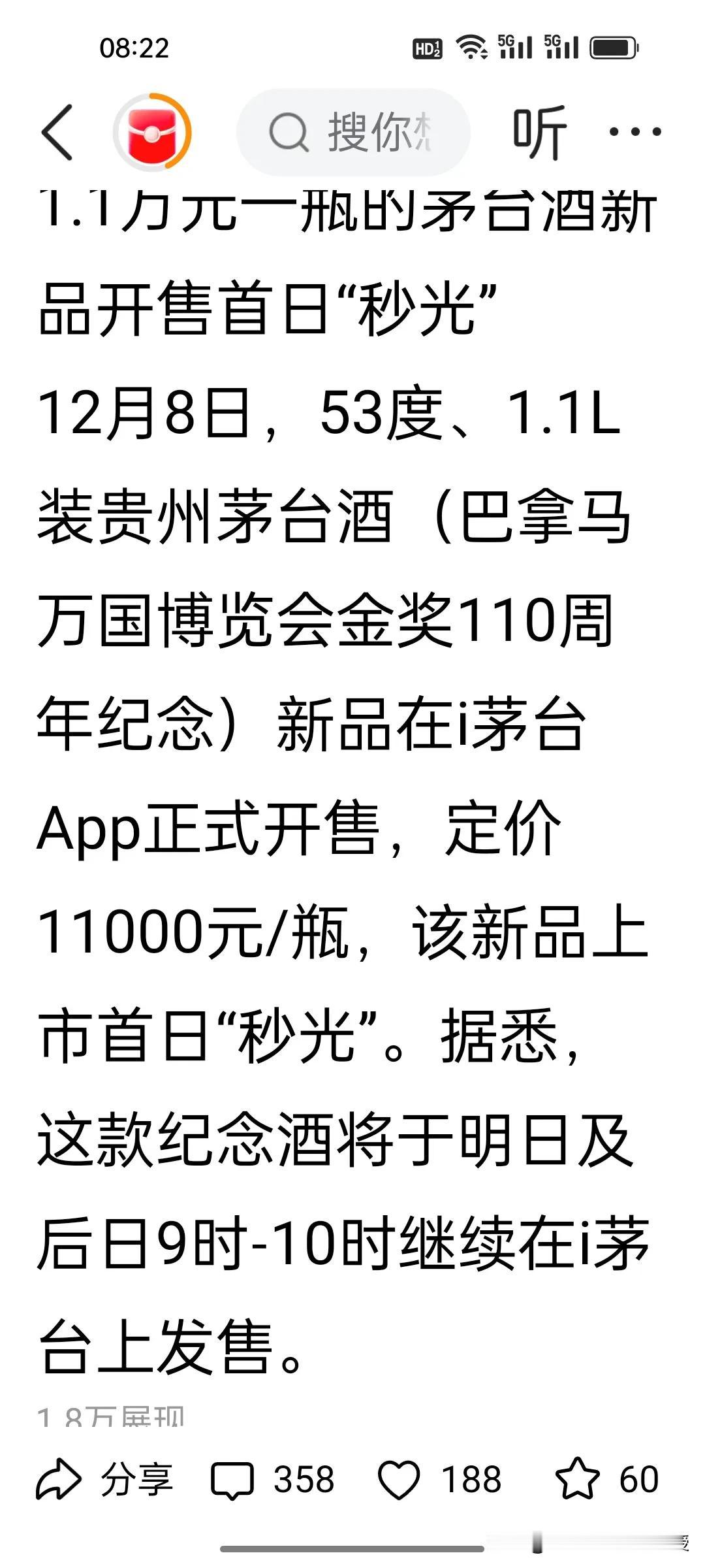 谁说茅台酒不好卖了的?昨天,53度,1.1L装的茅台新品上架后秒罄,这款酒售价高达1.1万,是普通装茅台价格的8倍。能买这款纪念酒的人对茅台是真爱了吧?至少对茅台的收藏价值是肯定的。 现在茅台的战略定位就是要“走出去”,这就是中国的奢侈品。五粮液前两天开票价都降价了,但是茅台一直没有松口,还是在维护经销商的价格,此举本质上是对品牌价值的坚守、对渠道生态的呵护,更是穿越行业周期的长远考量。茅台这种坚持以长期主义是非常正确的战略定力。不过,茅台的股价已经阴跌了半个月,近年底了,今天也应该有个漂亮的反弹了吧?