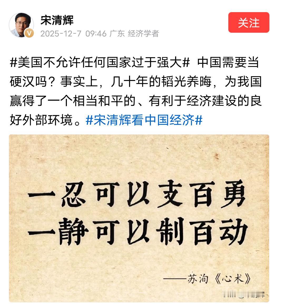 宋清辉说,既然老美不允许任何国家强大,中国就应该继续韬光养晦,当缩头乌龟。 宋清辉连自己家孩子都整不明白,他懂个屁!跟祥林嫂似的絮絮叨叨,简直可笑至极! 中国发展到现在,还能继续韬光养晦吗?即使再怎么做缩头乌龟,老美也不会放弃针对我们的遏制打压。实力已经不允许我们低头前行!