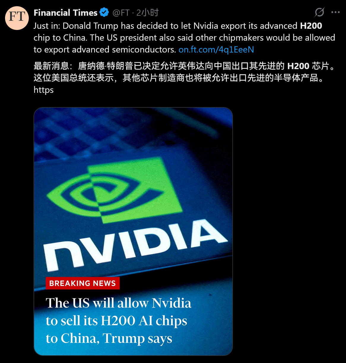 特朗普已决定允许英伟达向中国出口其先进的 H200 芯片据说会加价25%