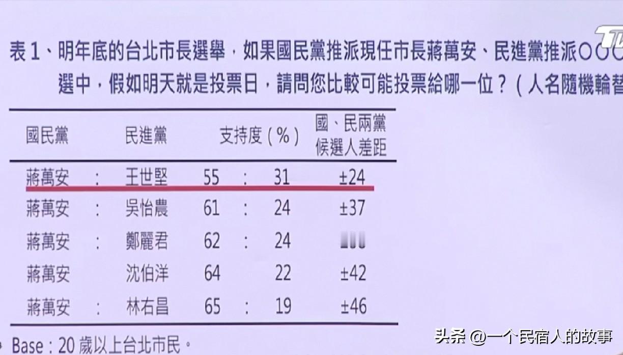 蒋万安民调一骑绝尘!2026台北市长选举国民党毫无悬念? 这两天,TVBS公布了2026年台北市长选举民调,国民党籍的现任台北市长蒋万安断层领先民进党对手几十个百分点,因《没出息》爆红的王世坚差距最小,差距24%,其他人诸如吴怡农、郑丽君、沈伯洋、等人差距更是三四十个百分点,更没法看。 台北向来是蓝营天下,唯一输的三次,第一次是国民党黄大洲新党赵少康分裂,让陈水扁赢一点捡漏,第二次是柯文哲联合中间和绿营大胜连胜文,第三次本来可以趁韩流崛起赢的,但韩国瑜不愿伤害柯文哲知遇之恩,唯一没辅选的就是台北丁守中,让柯文哲以惊险领先连任。
