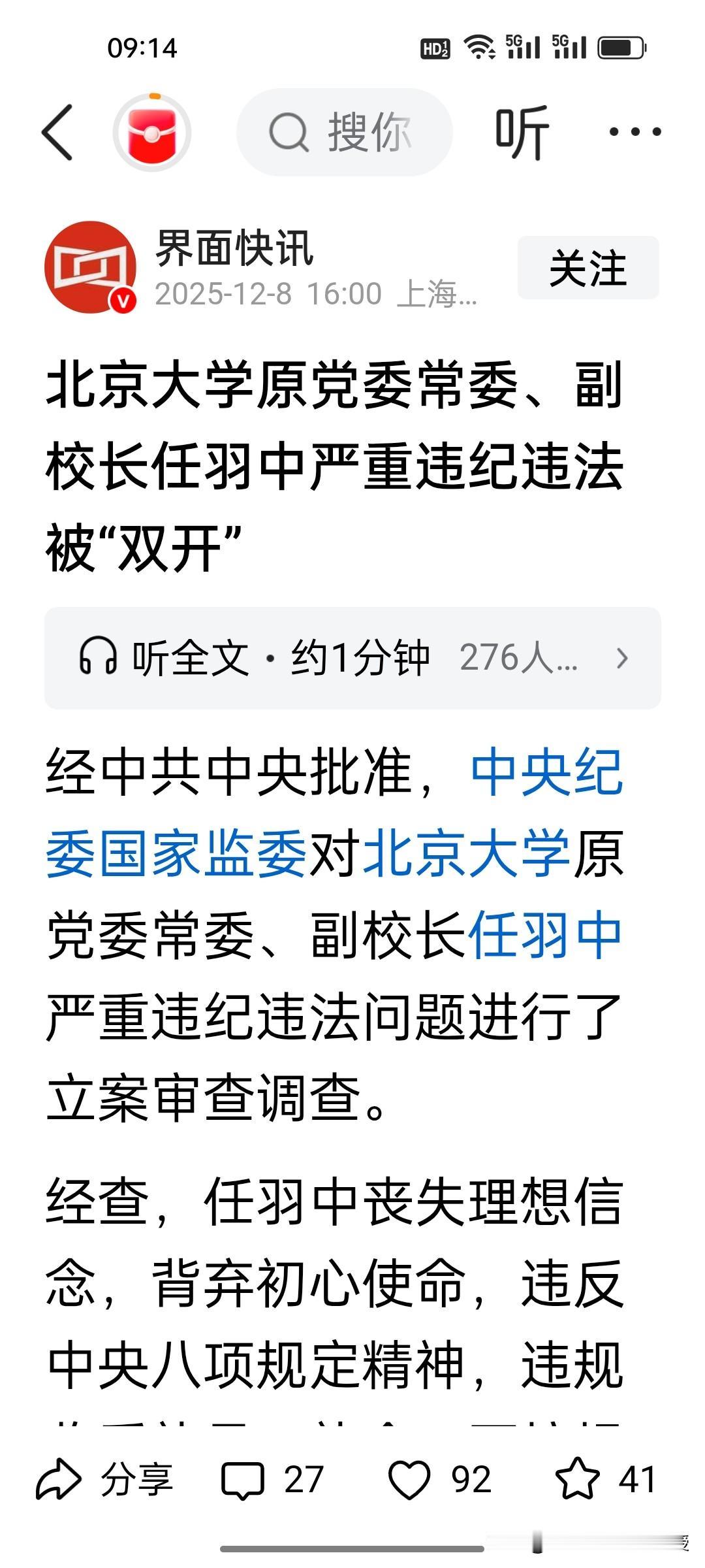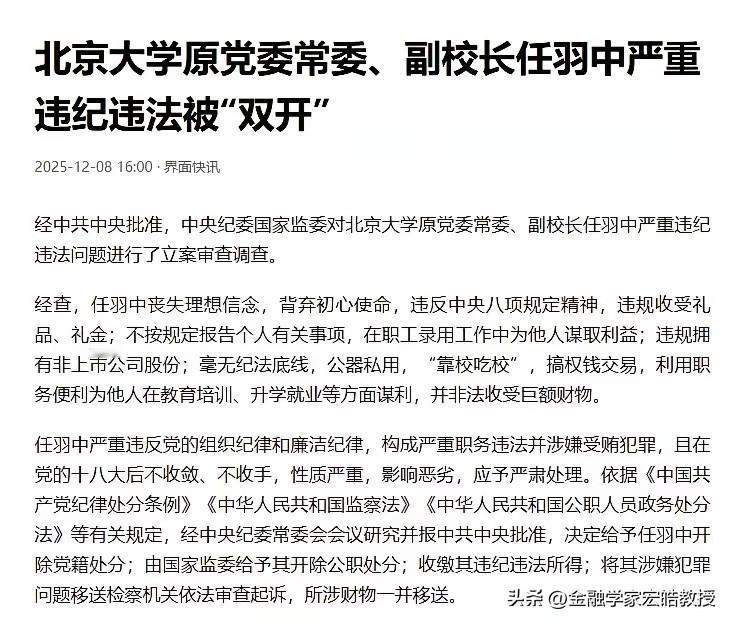 44岁就能当上北大副校长,45岁却落马了。看这位80后任羽中前半生可谓顺风顺水,一路开挂,从四川文科状元到成功保研,再到留校任教,最后攀至接近北大最高的行政级别。这对于普通人来说都是遥不可及的事情,任羽中在44岁都已经实现了,可还是一个“贪”字害了他,急切地想权力变现,于是“靠校吃校”,收人钱财,帮人升学就业,也就是说,有一些不符合北大升学或者是就业的人,也已经在北大入职或者是上学,这些人也应该“牵出萝卜带出泥”。