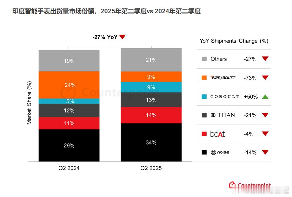 印度的智能手表出货量在2025年第二季度同比下降了27%,这是连续第五个季度下降。但是售价在1.5万至3万印度卢比(相当于人民币1000~2400)之间的高端表型出货量翻了一番,反映出消费者对先进、功能丰富的产品的需求增强。(Counterpoint)