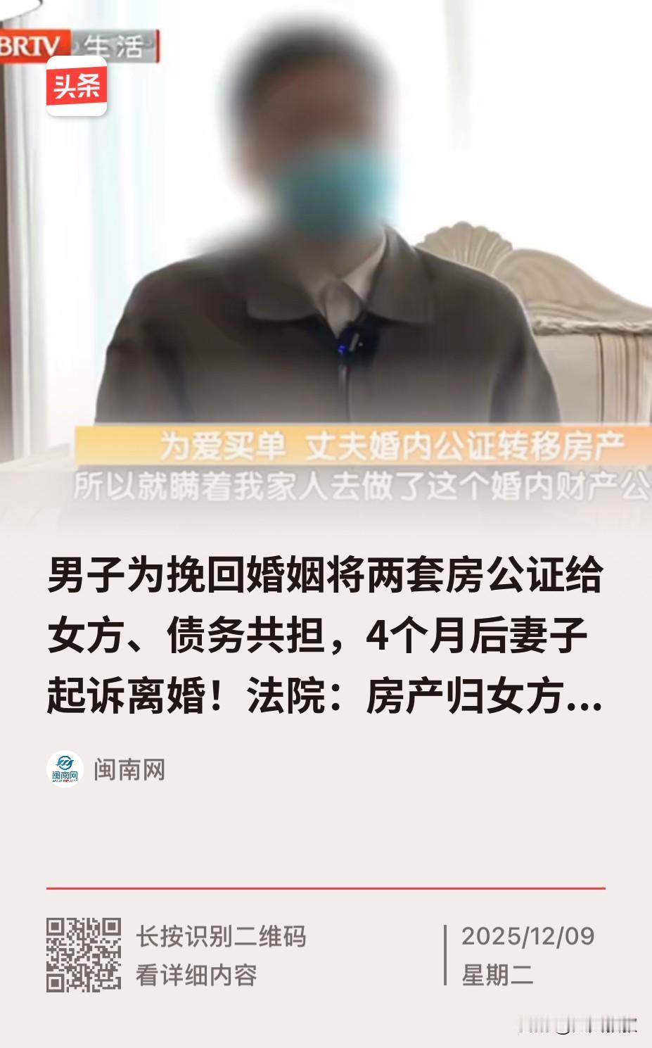 北京,一男子贷款买房后和女友结了婚,婚后女友不愿意和婆婆一起住,夫妻俩决定再贷款买一套,结果因为还贷压力太大两人闹了矛盾,男子为了挽回婚姻配合女方去做了公证,两套房子归女方,债务则由双方共担,结果前脚刚做了公证,女方后脚就去起诉离婚。 据悉,2013年的时候,男子王某首付贷款买了一套房子,因为当时王某刚刚成年不久,所以房子贷款都是由王某和其父母来还款,而父母也在交房之后搬了进去和王某一起生活。 2016年的时候,王某认识了女友孙某,两人便登记结婚,婚后,一家人都生活在这套房子里,可是孙某却因为觉得和公婆一起住不方便,于是就提出再买套房子。 随后,夫妻二人又买了一套新房,因为资金不足加上贷款问题,两人向第三方贷款买下了新房,而第三方贷款的年利率为24%。 高额的还贷压力让两人不堪重负,最终矛盾频发,为了挽回婚姻,王某配合孙某来到公证处,将两套房子公证给了女方,而且贷款是双方共同负担。 谁知,仅仅4个月之后,孙某向法院提起了诉讼,要求离婚并分割房产,这下王某彻底傻了眼。 事发后,网友纷纷谴责女方,觉得女方太有心机了。 有网友表示,女方是有心谋房产与财物,其实男方为了挽回婚姻已经做得很好了,但是女方却处心积虑,这下男的太被动了。 还有网友说,当把自己手里仅有的筹码送给了女方,结果使自己和父母连居所也失去了,基本可以断定,这个男人没有了退路,已经面临绝路。 其实,王某将这套2013年买的房子转移给女方,如果是王某自己的个人财产,这倒是无可厚非,但是,如果王某的这套房子,是王某以及王某父母共同还贷,甚至说是王某父母支付的首付款,那么,这套房子是谁的,其实就有疑问了。 因为如果是王某父母支付的首付款,甚至之后还偿还贷款,这就说明,登记在王某名下的房子,王某也许只是名义上的所有人,或者说这套房子是王某和其父母的共同财产,王某是无权处分的。 当然,如果这套房子王某是登记人,而且还自己偿还贷款,那么,这套房子王某如何处理,也是王某自行能够决定的。 当王某将两套房子都赠与给女方,而且还经过了公证,民法典就规定,经过公证的赠与合同或者依法不得撤销的具有救灾、扶贫、助残等公益、道德义务性质的赠与合同,赠与人不交付赠与财产的,受赠人可以请求交付。 所以,女方要求男方交付房屋,也无可厚非。 事发后,女方独自偿还了两套房子的贷款800多万后,法院判决两套房子归属女方,男方负责支付女方赔偿400多万元。 而后,女方向法院提起了强制执行,要求王某一家三口限期搬离这套2013年买的这套房子。 对此,你对本案有什么看法? —————————— 关注我,带你评析法律热点,关注冷暖人生。 文章原创,抄袭必究