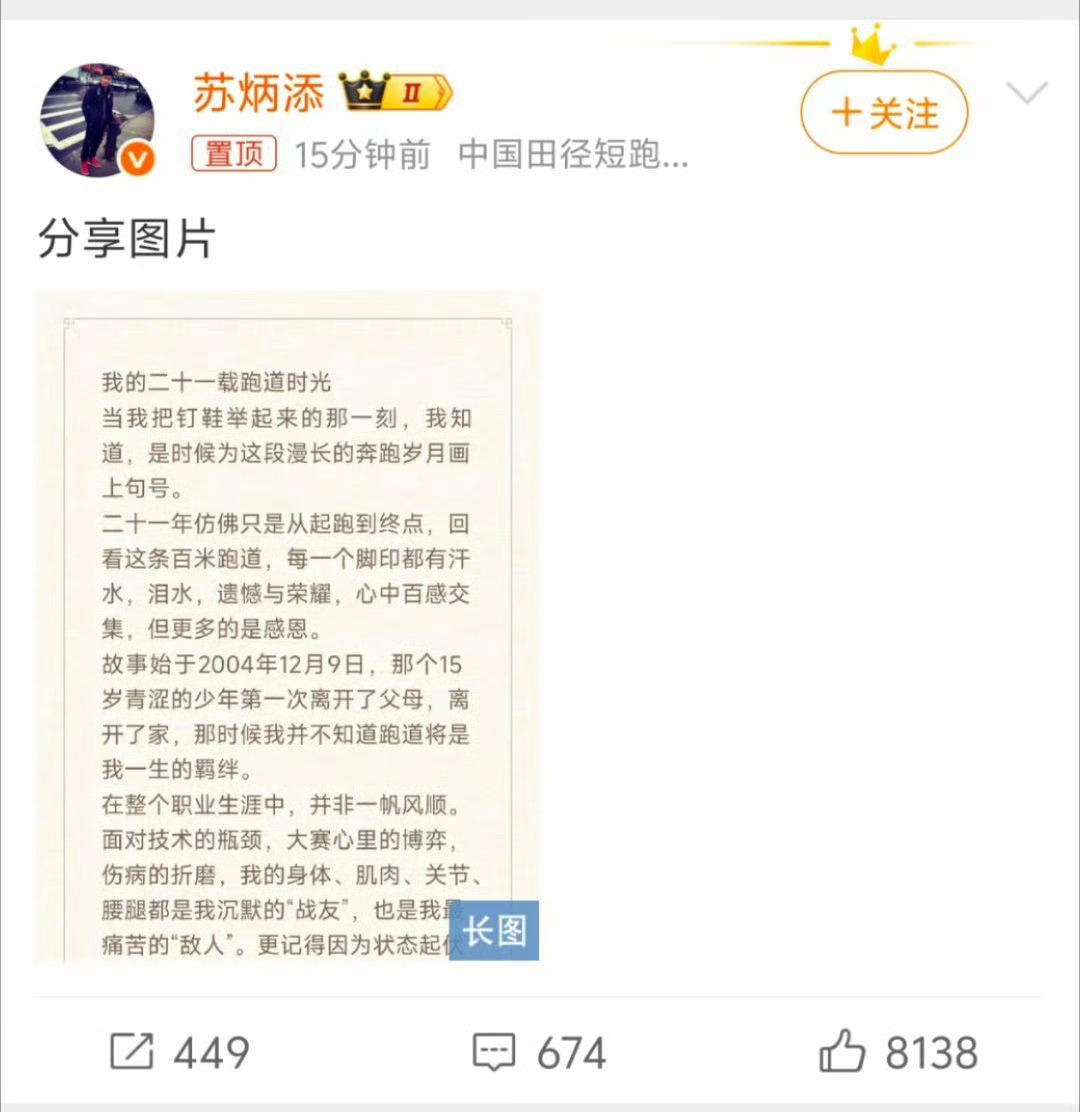 苏炳添退役苏炳添发长文宣布退役12月9日,男子100米亚洲纪录保持者、中国短跑名将苏炳添在社交媒体发布长文,正式宣布退役。他回顾了自己长达21年的跑道时光,向跑道告别:“再见啦,我最亲爱的跑道,你见证了我的青春,雕刻/磨砺了我的意志。未来我将以另外一种方式与你继续同行。”