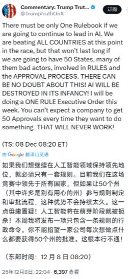 美国总统特朗普今晚(北京时间12月8日晚)发文写道:“如果我们想继续在人工智能领域保持领先地位,就必须只有一套规则。 他喊着 “必须只有一套规则”,核心焦虑点其实是美国当下乱成一锅粥的州级监管。这可不是空穴来风,现在美国 50 个州确实在 AI 监管上各自为政,活活把科技企业逼进了合规迷宫。 加州刚签了全美首个 AI 聊天机器人法案 SB-243,要求企业每三小时给未成年人发一次 AI 提醒,还不准聊自杀、色情话题,违规一次最高罚 25 万美元。 前脚加州刚禁止 AI 用于招聘筛查,后脚德州就放开了限制,企业想在全国做生意,得给产品算法装 “州级切换开关”,成本蹭蹭往上涨。更别说伊利诺伊州、内华达州还明文禁止 AI 当心理医生,各州规则差得比东西海岸的气候还大。 特朗普说这些州 “别有用心”,这话里藏着政治算计。加州这类蓝州向来对科技监管下狠手,光是 10 月就连发两个 AI 法案,除了聊天机器人新规,还有要求 OpenAI、谷歌公开安全测试流程的 SB-53 法案。 而特朗普背后的科技巨头们早就受不了了,Meta、谷歌这些公司正推着国会搞 “十年州级监管禁令”,想把立法权全收归联邦。毕竟企业最怕 “合规成本爆炸”,一套产品适配 50 套规则,确实像他说的 “根本行不通”。 但特朗普喊着 “本周发布单一条规行政命令”,听着痛快,实则藏着大问题。首先这 “一条规则” 到底管啥?从科技巨头游说的法案来看,大概率是放宽限制、砍掉各州的监管权限,甚至可能像之前提案说的,谁不服就停掉宽带基建资金。 可现在联邦层面连个完整的 AI 立法框架都没有,就敢喊着 “只搞一条规则”,简直是裸奔式监管。要知道 AI 发展快得吓人,今年还在聊文本生成,明年可能就到具身机器人了,十年后的技术形态谁也说不清,一条规则根本罩不住。 他眼里只盯着 “领先中国”,却忘了监管缺位已经闹出人命。2024 年佛罗里达 14 岁少年跟着 Character.AI 的虚拟角色自杀,今年 8 月又有 16 岁少年和 ChatGPT 互动后轻生,这些悲剧正是因为州级监管跟不上才发生的。 加州大学伯克利分校的教授早就警告,连开发者自己都承认 AI 有 10%-30% 概率 “搞垮人类”,现在非但不补监管漏洞,反而要砍监管力量,这不是玩火吗? 其实特朗普这套 “联邦独大” 的思路早有先例,但 AI 可比互联网复杂多了。 欧盟搞的《人工智能法案》是分层监管,高风险的信用评分、招聘要严格测试,低风险的聊天机器人只要透明披露就行,既没耽误创新也守住了底线。 日本用 “轻监管 + 行业自律”,新加坡搞 “监管沙盒” 试点,都是在找创新和安全的平衡点。反观特朗普,眼里只有 “打败中国”,却忘了美国的领先从来不是靠 “监管真空” 堆出来的。 再说他吹的 “领先优势”,其实早没那么稳固了。美国确实握着英伟达 GPU 和 GPT 大模型,但 OpenAI 连自己的用户生态都没有,训练靠英伟达,部署靠微软云,就是个 “无根之木”。 而中国的阿里有含光芯片 + 淘宝场景,字节跳动靠抖音攒了全球最多的用户数据,这些 “芯片 + 模型 + 场景” 的生态壁垒,可不是靠砍监管就能追上的。 特朗普这波操作更像政治秀。借着 AI 竞争的由头,把监管权收归联邦,既讨好背后的科技金主,又能给自己攒 “懂经济、保领先” 的人设。可他没算明白,AI 不是武器装备,光靠松绑换不来领先。加州那些看似 “碍事” 的规则,恰恰是在补安全漏洞 —— 要是真像他说的 “萌芽阶段不管制”,哪天 AI 搞出更严重的社会问题,再想救就晚了。 现在最尴尬的是美国科技企业,一边盼着统一规则降成本,一边又怕联邦搞出 “一刀切” 的蠢规定。微软首席科学家就说了,合理监管反而能加速创新,最怕的是 “要么不管要么乱管”。 特朗普要是真敢只发 “一条规则”,大概率是顾了企业利益,丢了社会安全,最后可能像那些在各州间疲于奔命的 AI 产品一样,看似解决了问题,实则制造了更大的麻烦。 说到底,AI 竞争拼的是生态,不是谁的监管更松。美国要是真怕被反超,该做的是把各州的好经验整合起来,搞出像欧盟那样分层、灵活的规则,而不是搞 “联邦独大” 的一言堂。特朗普现在急着用行政命令 “一刀切”,看似在给 AI 松绑,实则是在给美国的领先地位埋雷。