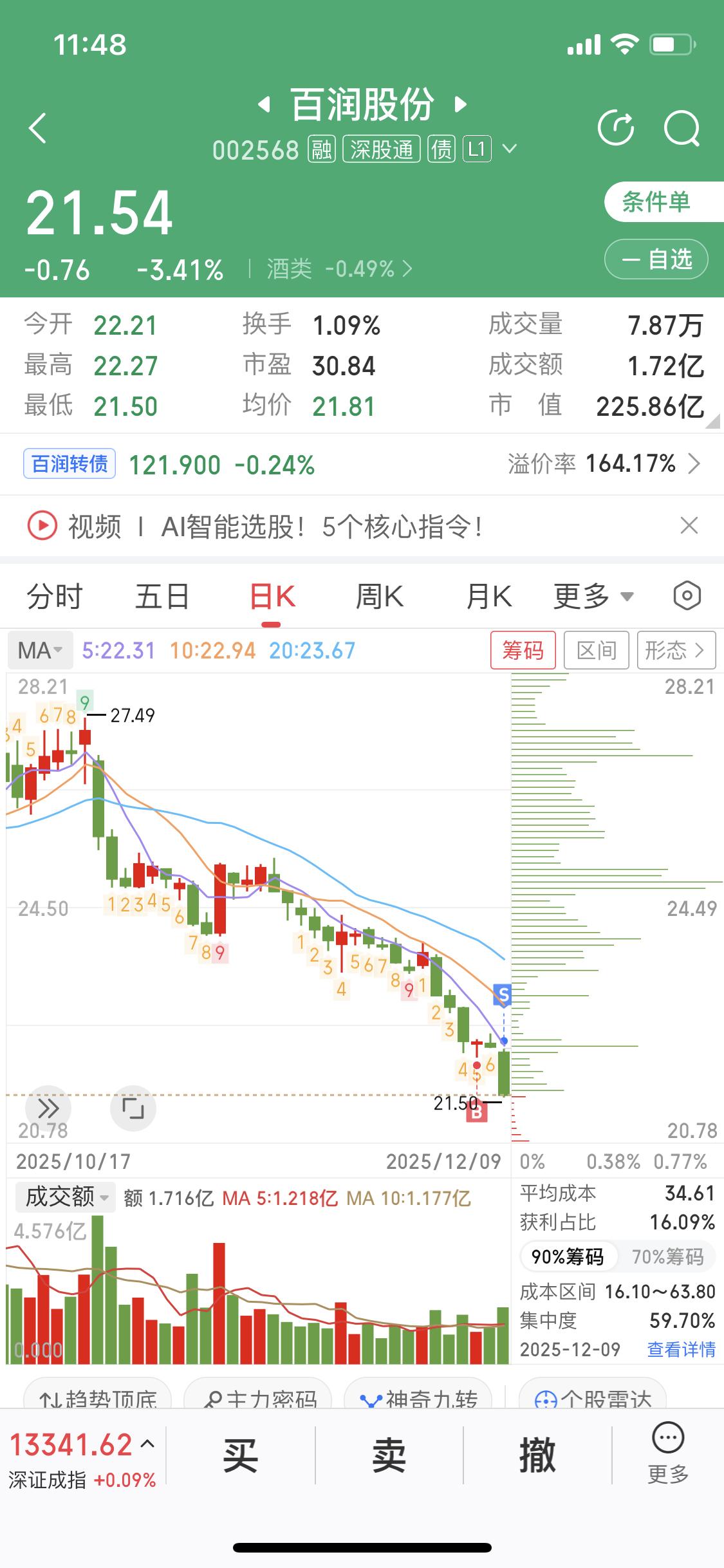 12月9日玩百润股份,真是被狠狠上了一课。本以为抄到底,结果妥妥抄在了半山腰。当天它直接下跌3个多点,我实在扛不住,中途割了半仓。 从数据看,截至10日11时,它就跌了2.02%,成交6380.92万元,主力资金净流出765.20万元。今年以来股价跌21.16%,近5个交易日跌5.45%,近20日跌12.21%,近60日跌15.73%。这跌跌不休的态势,谁顶得住啊。它主营香精香料和预调鸡尾酒,本以为是潜力股,没想到成了“绞肉机”,以后选股可得擦亮眼睛了。