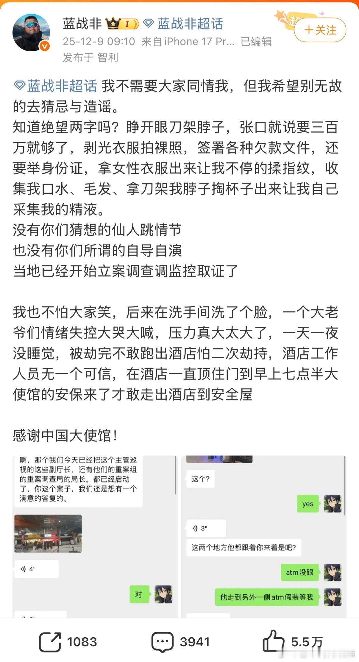 蓝战非 在南非遭遇国人绑蓝战非 全球旅游的蓝战非被老乡绑了!被绑架的蓝战非急中生智掏出了一本中国护照,结果绑匪也掏出了一本中国护照。谁说中国人不骗中国人的?蓝战非是游戏圈的“元老级”红人,早年是ACE战队队长,凭借精湛操作圈粉无数,退役之后成了游戏主播,还和林俊杰开过黑,再后来成了现在的旅行博主,曾自爆一年收入可达九位数。昨天晚上,他自爆在南非旅游时被绑架了,并表示这是一场精心策划且有预谋的绑架。绑匪先是买通了机场工作人员,得到了他的航班信息,然后又买通了酒店人员,晚上12点用房卡推开房门,还是当地五星级酒店,没有任何防备的蓝战非,就这样被一个同胞以及两个当地黑人堵在房内整整5个小时。接着就是各种威胁转账,把能赚的钱都转走了。之后,三名劫匪还不罢休,又强行拉着蓝战飞把能套的网贷全套了一遍。劫匪为了防止报警,不仅收集了蓝战飞的指纹、毛发、口水,还让两个当地黑人强行取精,以便后续买通当地的南非黑警伪造性侵记录。而在这5个小时的聊天内,蓝战非套话得知该名劫匪早在半年前就已经开始准备,所以才精准得知了时间以及地点。早在白天时,该名劫匪就在机场提前蹲点,装成粉丝制造偶遇提出一起游玩,而且还在门口埋伏了3组帮派成员伪装成的出租车。好在蓝战非警惕性强,选择了官方出租车,并拒绝了他的同行要求,在白天躲过一节。A计划失败,于是劫匪火速实行B计划,选择在晚上行动,没防备的蓝战非,就这样被绑了。到底是仙人跳?还是自导自演?全程就只有他自己在发声,事实不明。但是他到底是怎么在被黑人架着脖子的时候还能射精的?要他的精子干嘛,难道要借腹生子继承他万贯家产么?我理解的华人作案应该是被逼供打伤,直接撕票。哪里需要还采集他的口水和精液这么复杂。南非每年那么多绑架案,就这个最吸睛了。只是因为这个涉及到了大v的精液......但万幸人没事,也期盼蓝战非能早点回国吧,就是不知道后续还能不能看到他的全球旅行了。